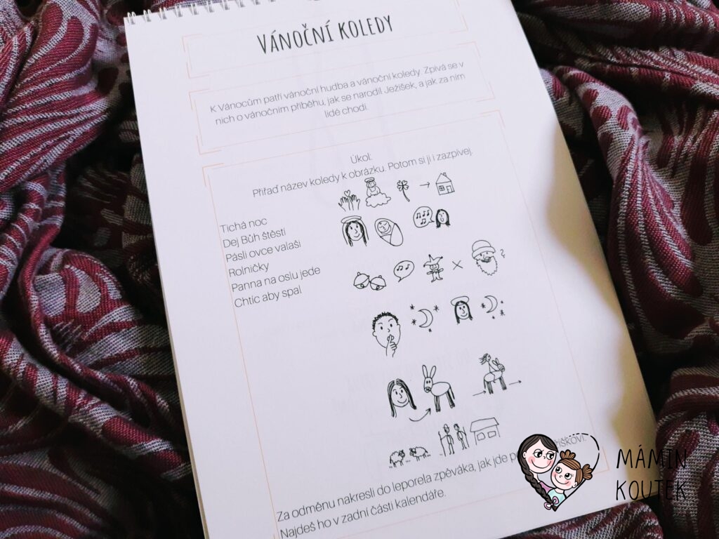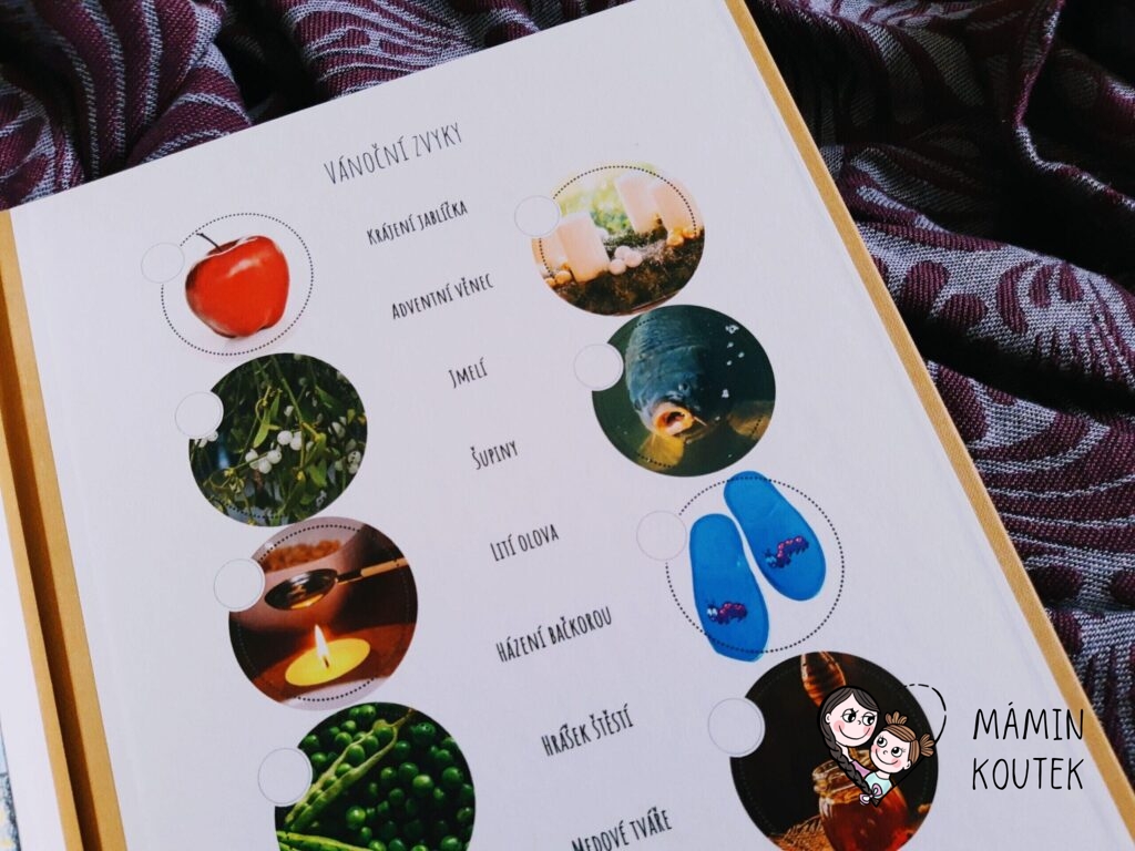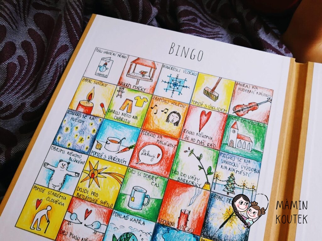 Dále zde najdeme již zmíněnou hru Bingo, která má krásné obrázky, které vypadají, jako by je právě někdo nakreslil. Na vedlejší stránce je pak také seznam vánočních zvyků, které si mohou děti odškrtnout, jakmile je splní.
