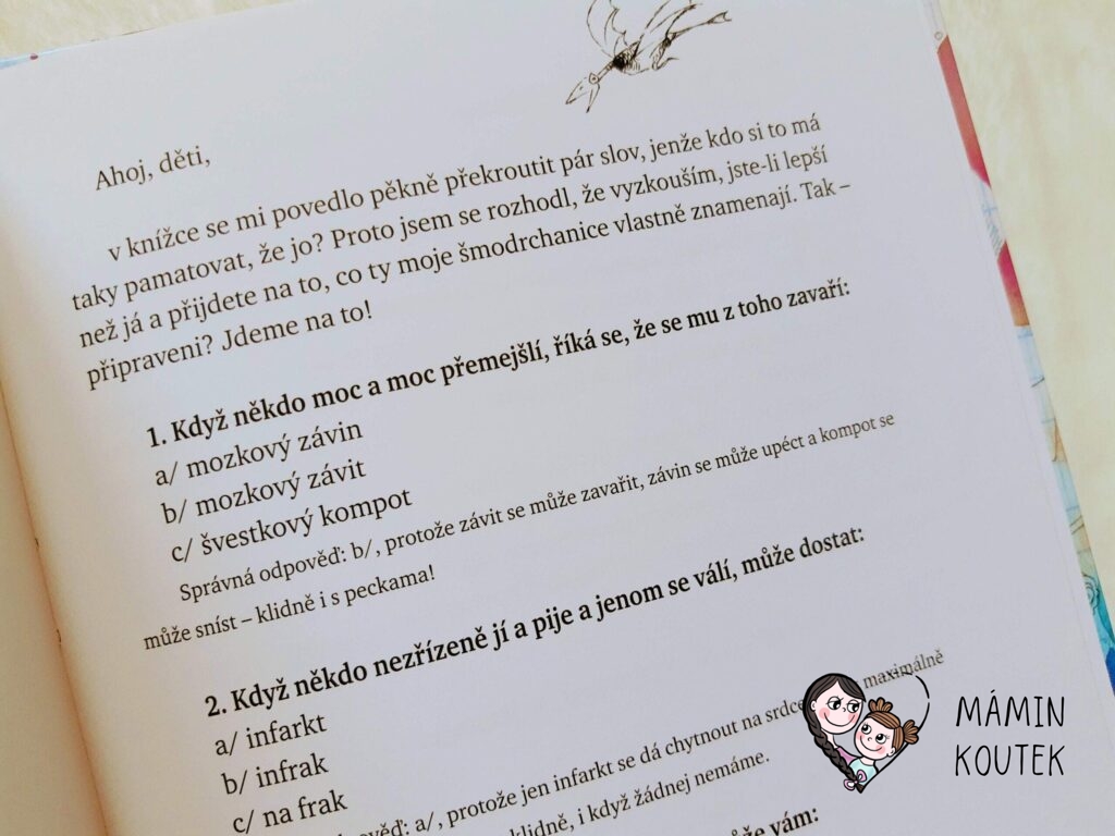 Na konci knihy děti najdou krátký kvíz, kde mají za cíl najít, která slova byla špatně překroucena. Například místo mozkového závitu závin…