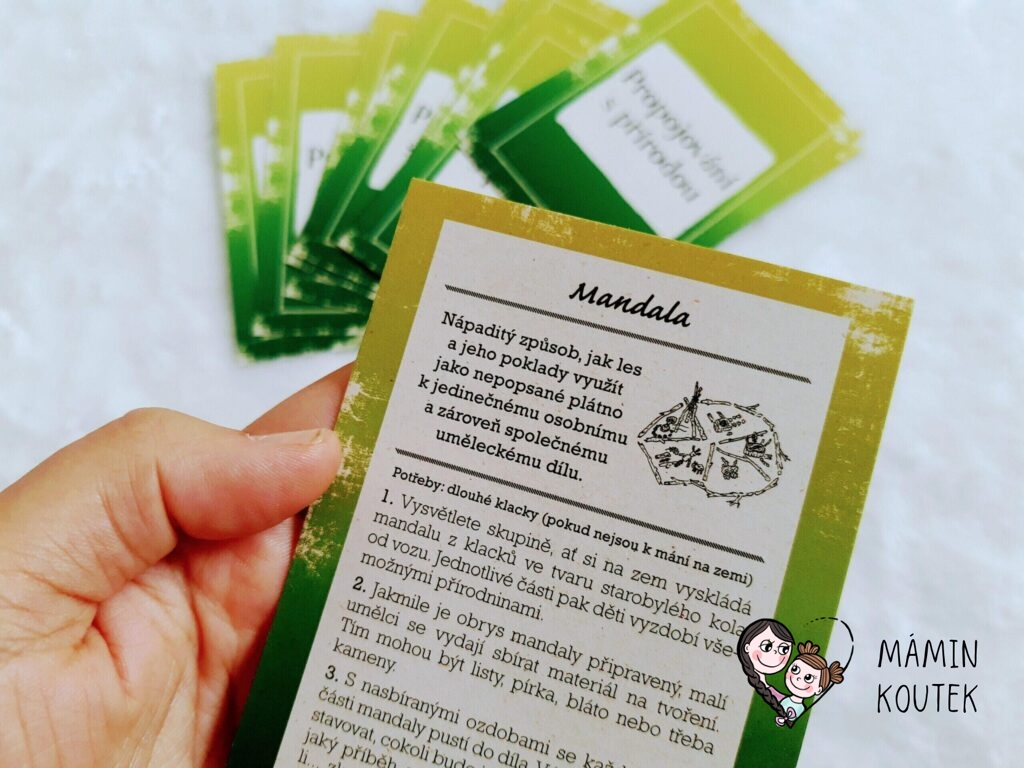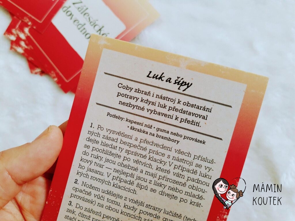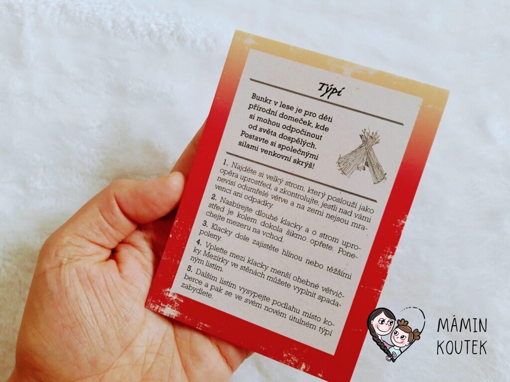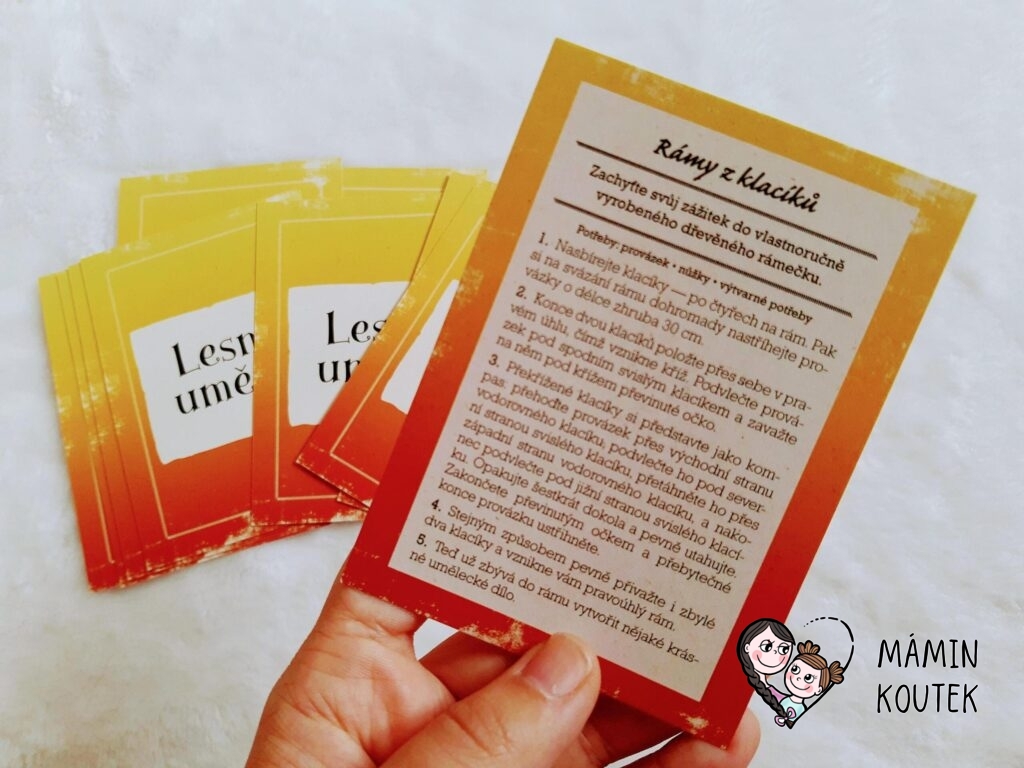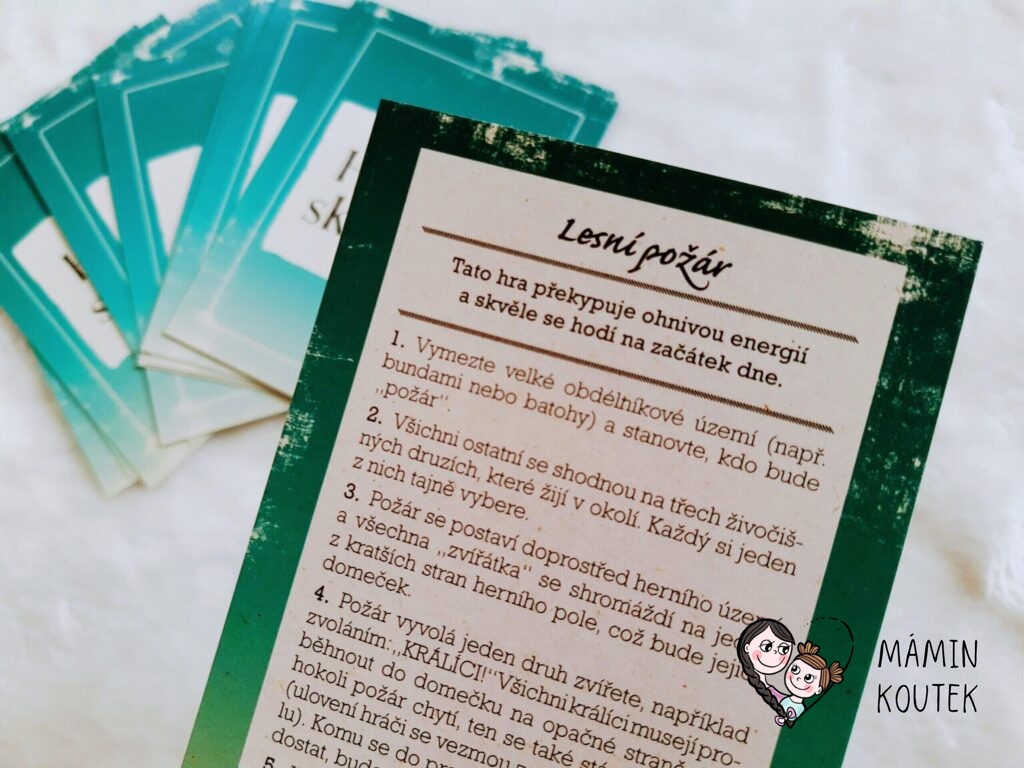 Karty Lesní škol(k)a nabízí přehled aktivit, kterými se dříve děti běžně bavily, ale v dnešní době už moc populární nejsou. Hry napomáhají v poznávání přírody a podporují vytváření vztahu k ní, což se mi líbí.