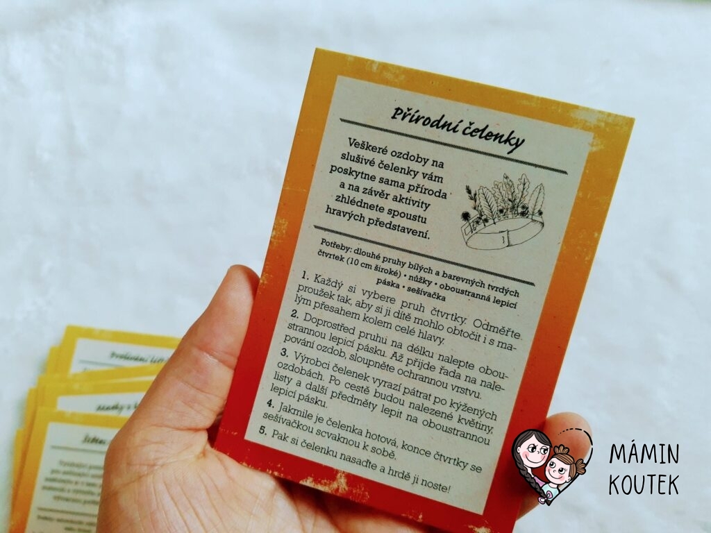 Na kartě je uveden název aktivity a k tomu shrnutí (jedna věta), o čem aktivita vlastně je. Poté následuje postup, jak ji realizovat. Na některých kartičkách najdete také seznam věcí, které jsou potřeba.