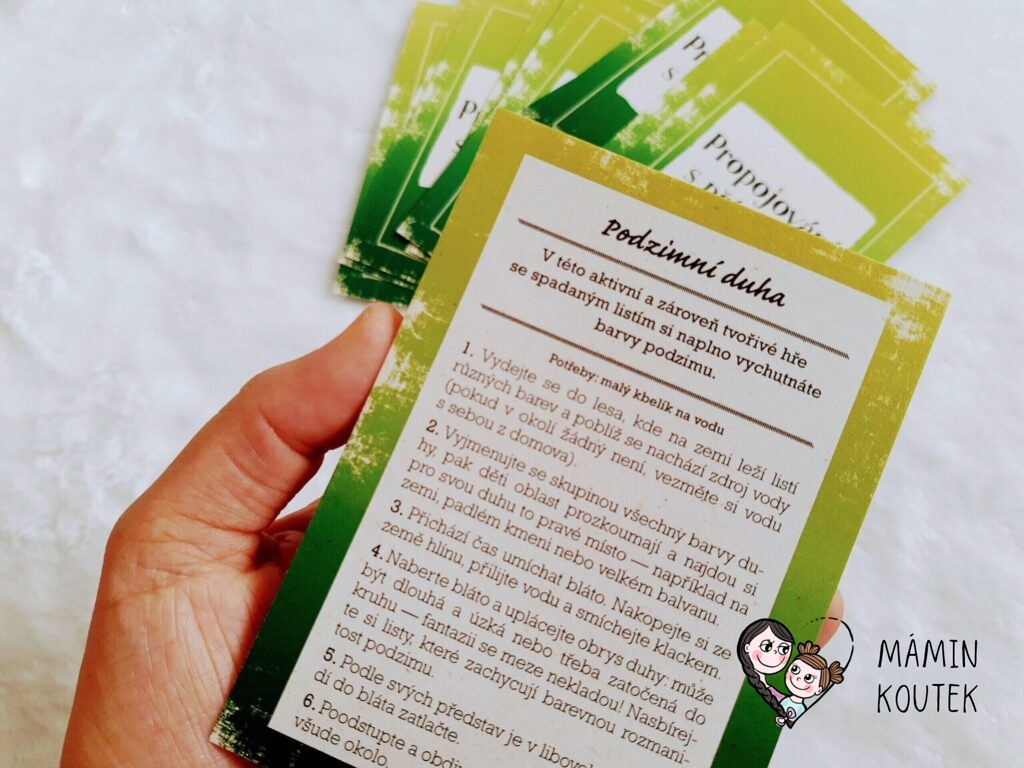 Zpracování formou karet je mnohem praktičtější než kniha, obzvláště pokud budete realizovat aktivity někde v terénu. Stačí vzít kartičku a zábava může začít. Je ale škoda, že krabička je dělaná akorát na karty a manuál se tam už nevleze. Ráda mám obojí na jednom místě (jinak to někde založím a nenajdu).