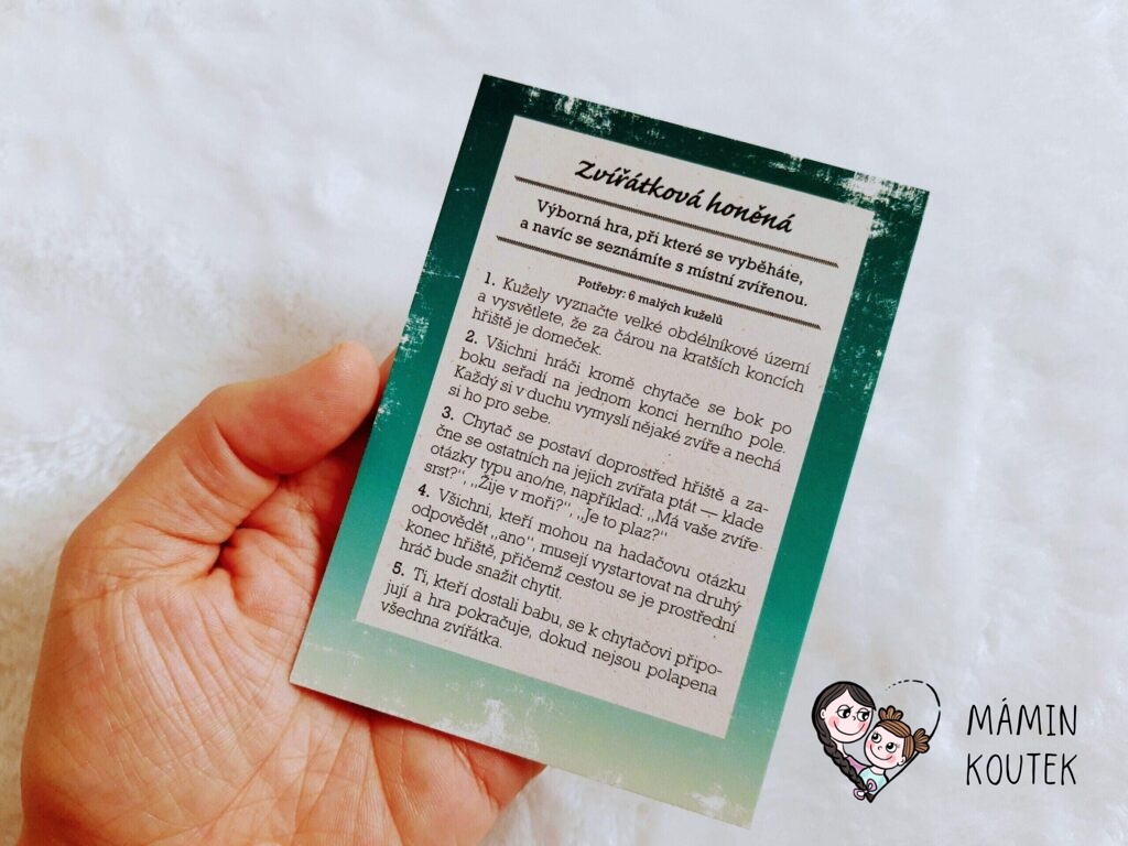 Poslední část karet využijete hlavně v případě více dětí. Jedná se totiž o různé hry – netopýr a můra, dravci na stopě kořisti, hladová ptáčata, mravenčí stezka, spící medvěd, jaké jsem zvíře, zimní pavučina, hop šup džn, hra na plíživého kojota, zvířátková honěná, hra na intuici a lesní požár.