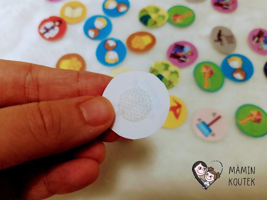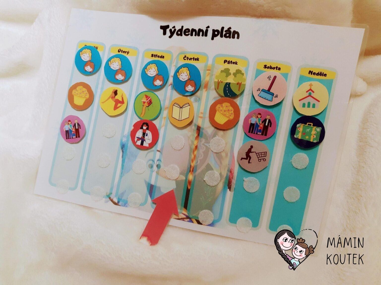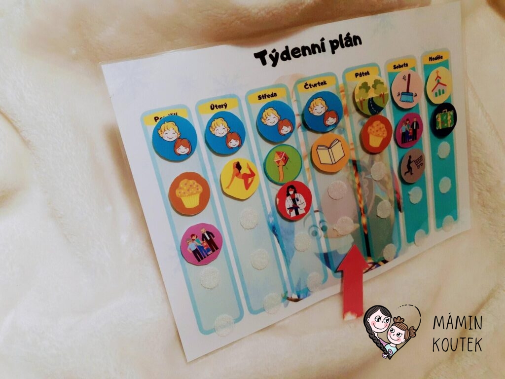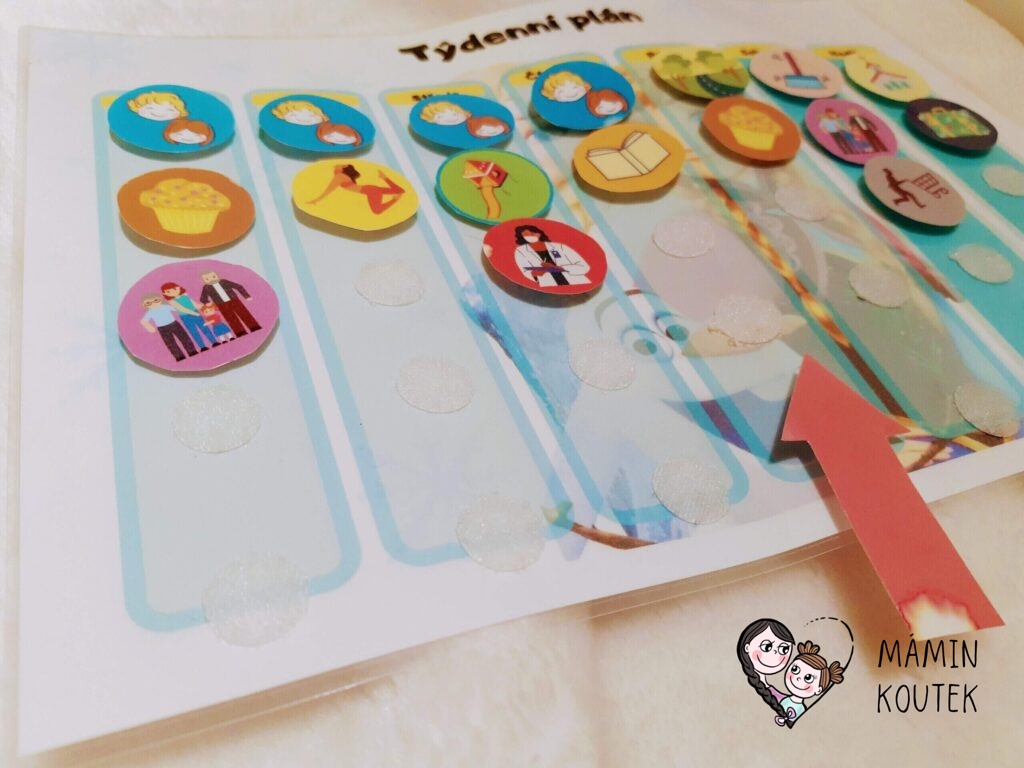 Tabulku i stránku s aktivitami jsem zalaminovala. Aktivity v kolečku vystřihla, podlepila suchým zipem a druhý nalepila na tabulku. Celý týdenní plán máme magnetkami přichycen na lednici a každé ráno posuneme šipku, ať dcera ví, který den zrovna je. Snadno pak vidí, jestli jde do školky, jestli přijede návštěva nebo nás třeba čeká úklid či pečení…