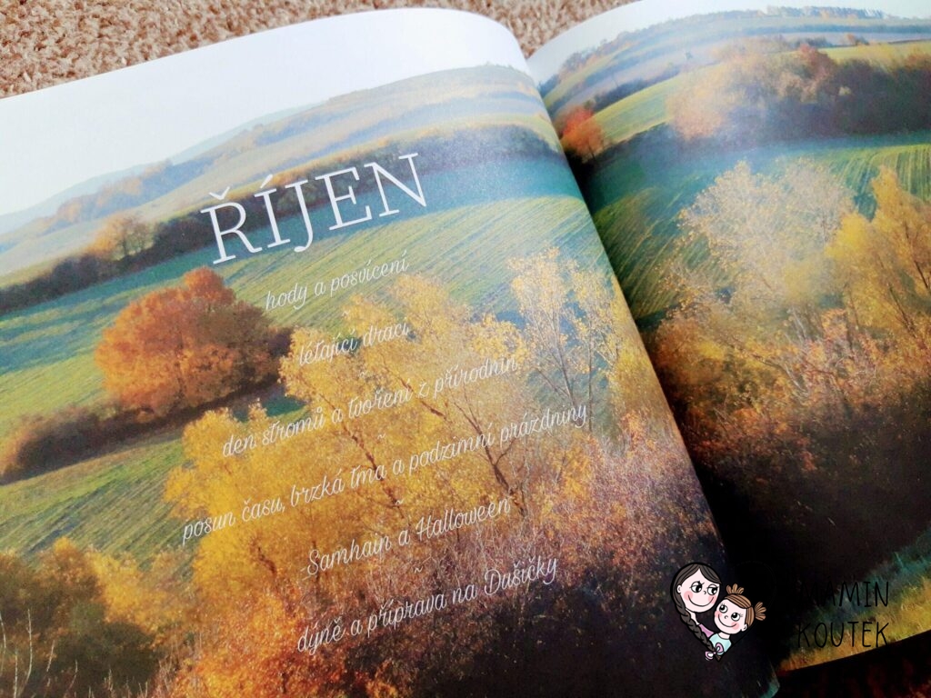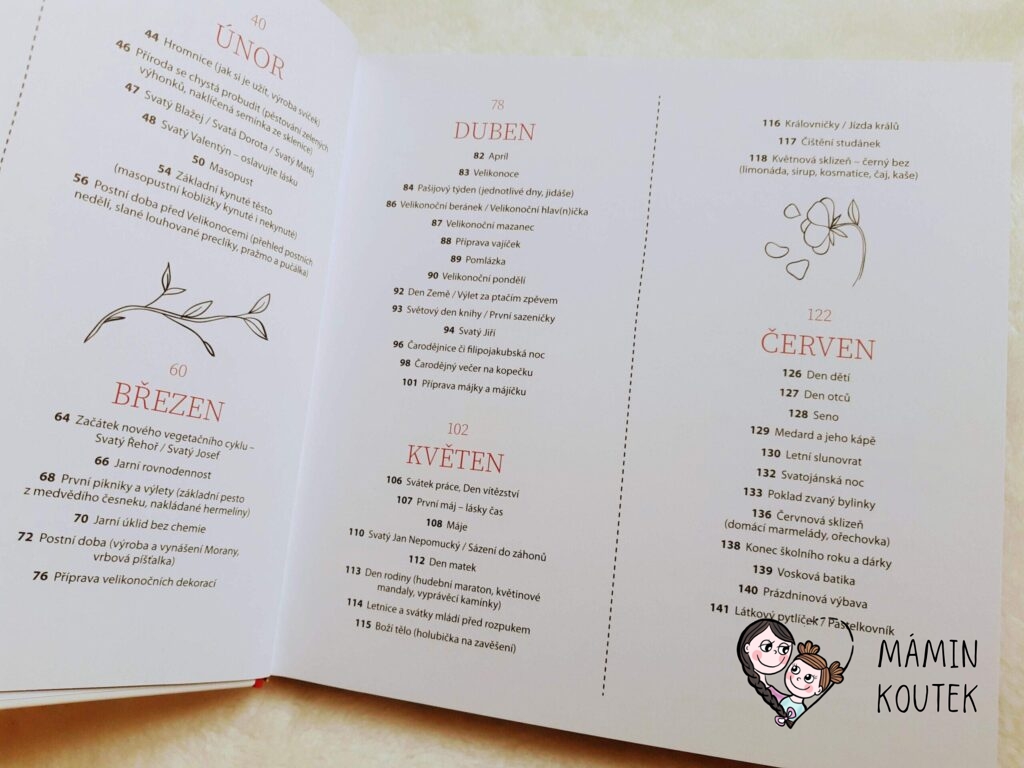 Poté kniha postupuje dle kalendářních měsíců. U každého měsíce najdeme na úvodu shrnutí, jaké svátky, akce a rituály nás v tomto čase čekají. Navíc jsou zde i tipy na tvoření a jídlo či pití, které si můžeme doma udělat.