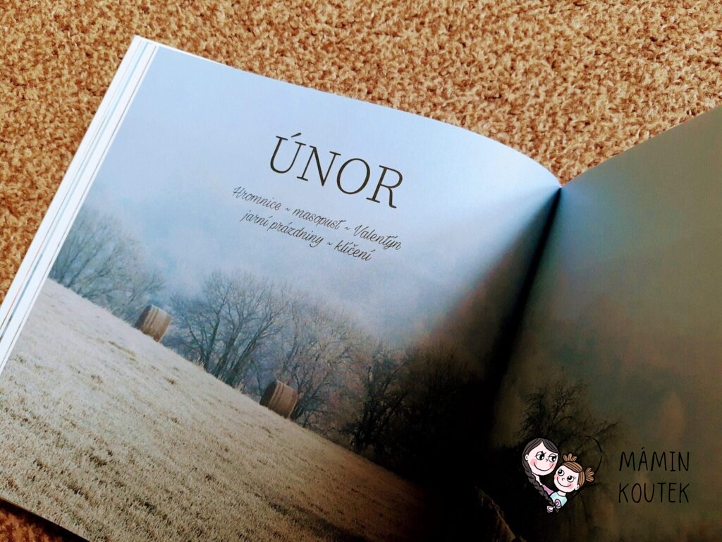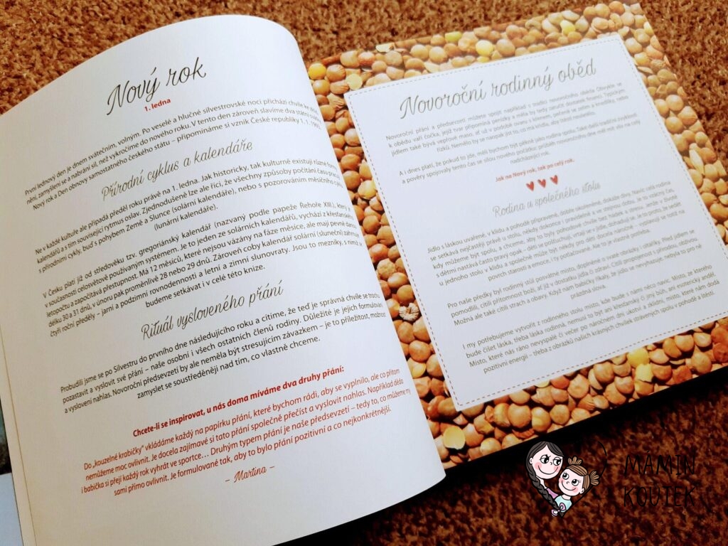 Kniha začíná klasicky měsícem leden. Zde nás čeká především oslava nového roku, svátek tři králů, začátek období masopustu a konec školního pololetí. Dále je vysvětlen rituál vysloveného přání, novoroční rodinný oběd, novoroční koledování a pozdravení, třikrálová koleda a sbírka, zimní kino nebo stínové divadlo. S dětmi si můžeme vytvořit fanfrnoch, novoroční přáníčko, ledovou lampičku nebo obraz. A milovníky jídla potěší určitě třikrálová bábovka, zázvorový čaj nebo kváskový chleba.