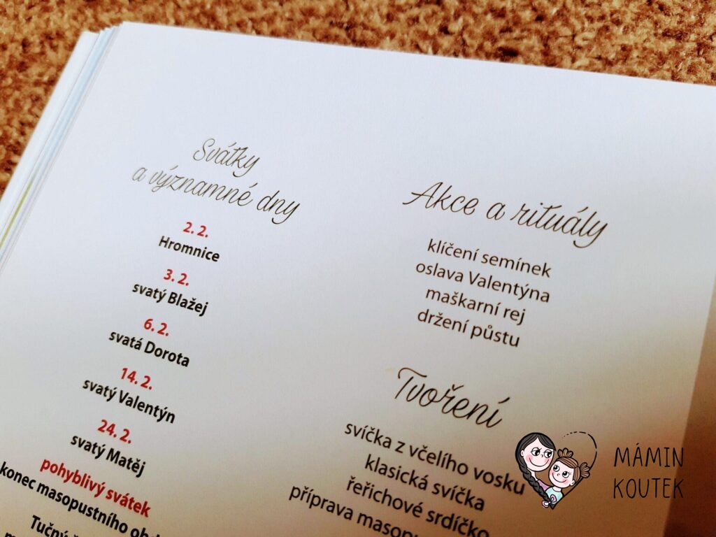 Na únor připadají hromnice, svatý Blažej, Dorota, Valentýn a Matěj, konec masopustního období nebo začátek půstu před Velikonocemi. Popsáno je klíčení semínek, oslava Valentýna nebo maškarní rej. Vyrobit si můžeme svíčku z včelího vosku, řeřichové srdíčko nebo masopustní masku. Z receptů pak najdeme třeba kynuté těsto, masopustní koblížky nebo slané louhované preclíky.