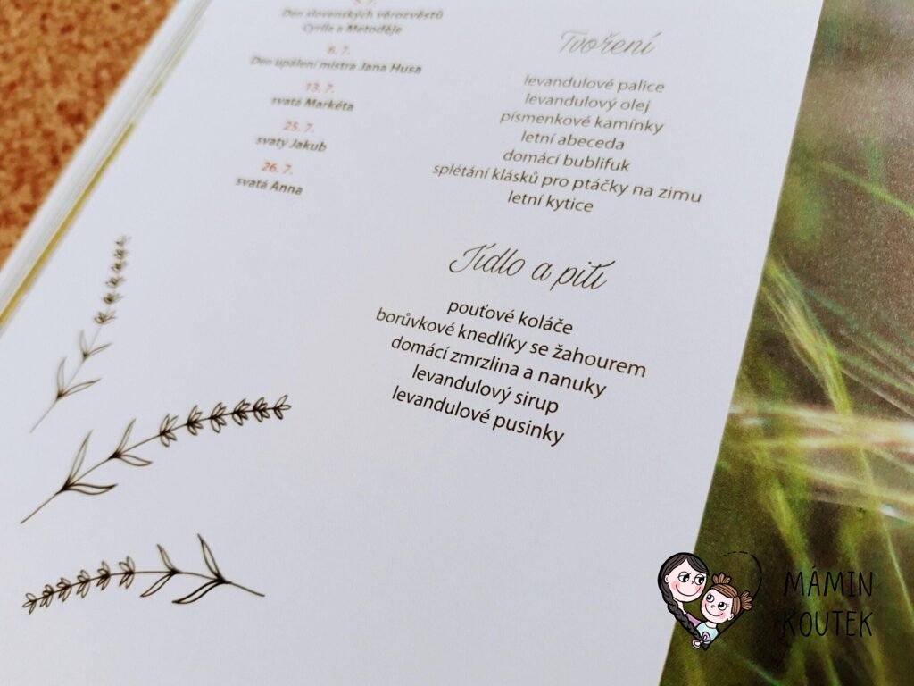 V červenci začínají dětem prázdniny, slavíme den slovanských věrozvěstů, den upálení mistra Jana Husa a svátky sv. Markéty, Jakuba a Anny. V tomto čase začínají žně, konají se různé poutě či borůvkobraní. Vyrobit si můžeme levandulový olej, letní abecedu, domácí bublifuk nebo letní kytici. Z pokrmů jsou pak pro toto období typické pouťové koláče, levandulový sirup nebo borůvkové knedlíky.