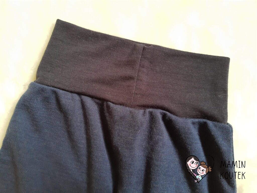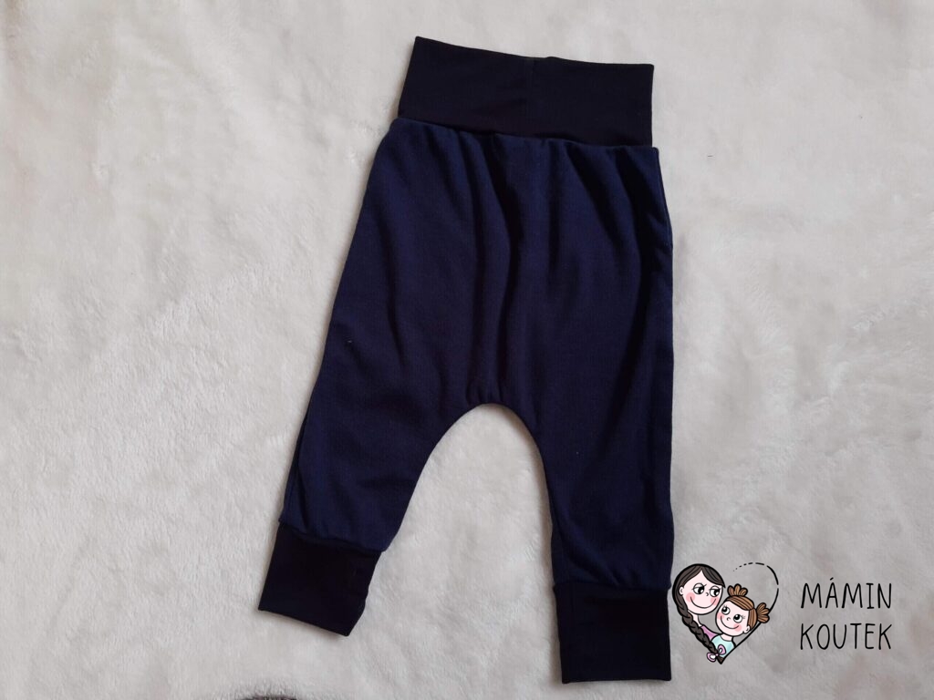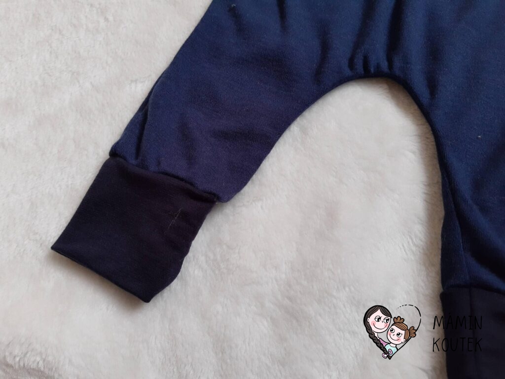 K bodyčku jsem dokoupila také harémky, což jsou v podstatě tepláčky, jen ne tak upnuté. Hodí se i na větší zadaček s látkovými plenami. Opět platí, že jsou mírně pružné a díky nápletům vydrží až tři velikosti, protože se dají snadno ohnout.