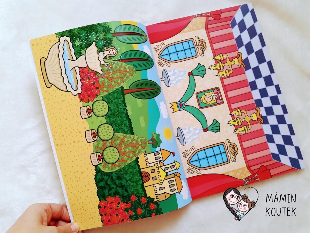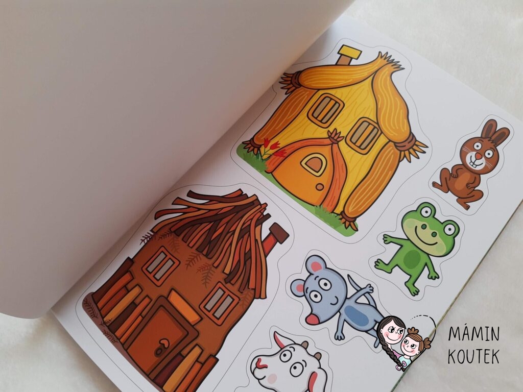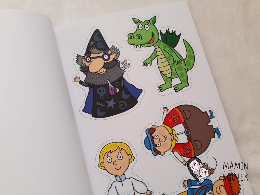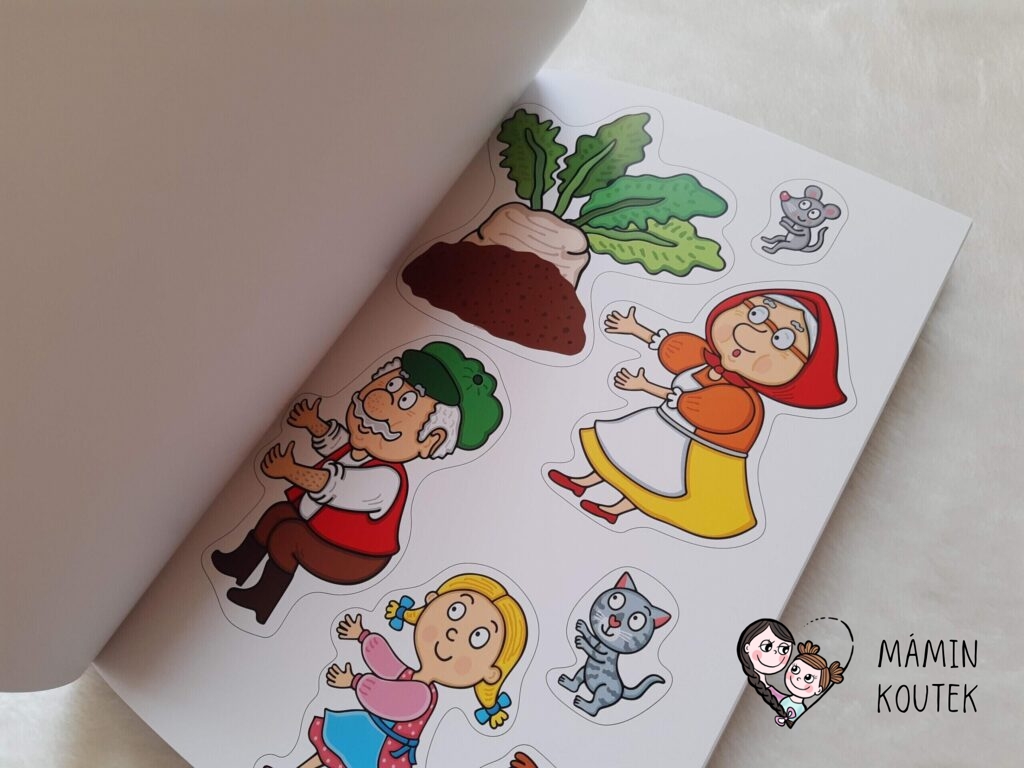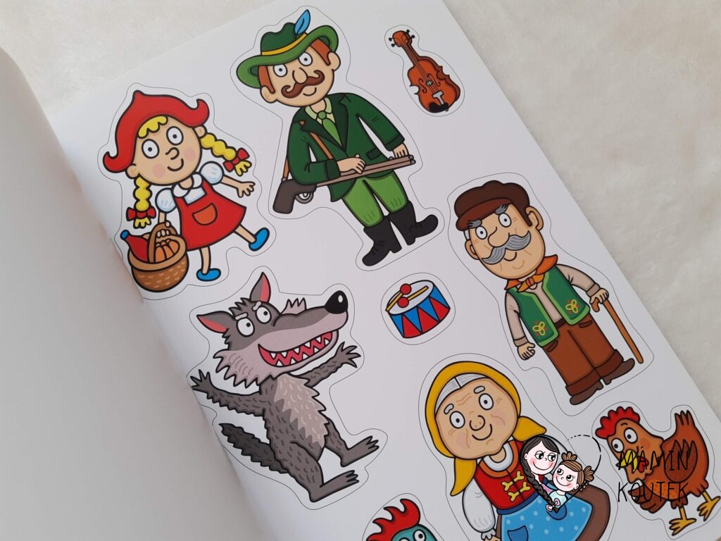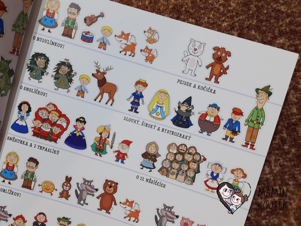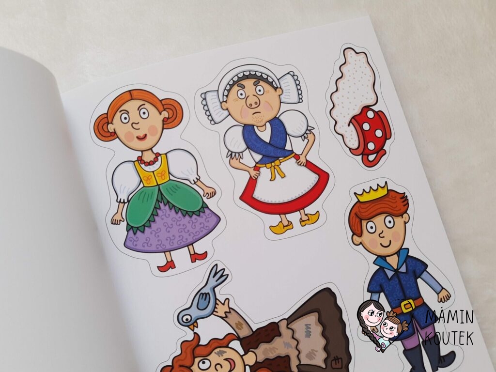 Na první stránce jsou miniatury postaviček, které v knížce najdeme. Na vedlejší stránce je pak znázorněno, jaké pohádky si můžete zahrát a které figurky při ní využijete. Některé postavičky patří do více pohádek (například princezna, král, kůň, babička a jiné).