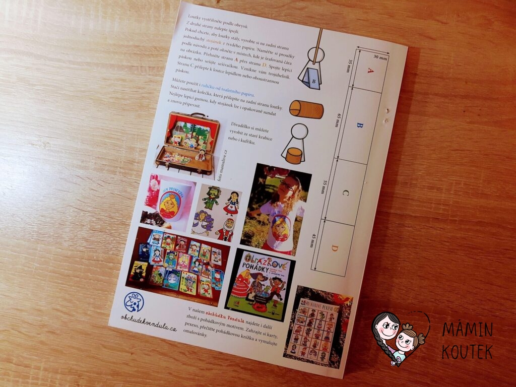Pohádkové divadélko dostanou děti jako dárek, takže fotky z akce přidám později. Každopádně se mi nápad moc líbí. Soubor obsahuje spoustu postaviček a můžete si s nimi zahrát minimálně 29 pohádek, což je poměrně hodně. Některé příběhy ani přesně neznám, takže se společně doučíme a snad si je pak i zahrajeme. Měli jsme papírové divadélka z dětských časopisů a Beky si s nimi od tří let celkem vyhrála. Je to zase jiný způsob, jak dětem přiblížit pohádky a jak je do vyprávění zapojit.