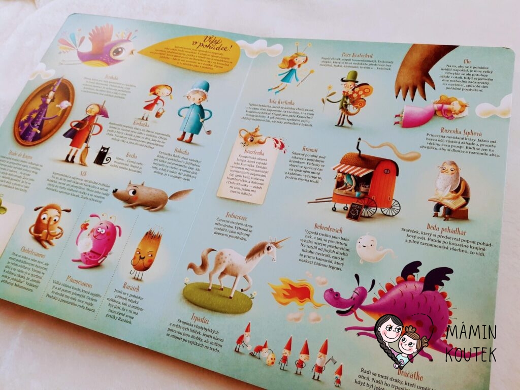 Na první dvojstránce najdeme krátké představení hlavních postav, jejichž příběh mohou děti v knize sledovat. Konkrétně zde uvidíme třeba Ježibabu, Karkulku, bábinku, Hrabě de Knijrn, vlka, kočku, raráška, vodníka, chobotosaura, mňamosaura, vílu Květinku, páže Kratochvíla, obra, Růženku Šípkovou, kramáře, dědu pohadkáře, Kouzlenku, jendorožce, Dobrodouška, trpaslíky nebo dráčátko.