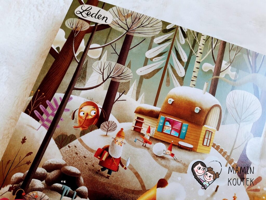 Poté už se kniha věnuje na každé dvojstránce jednomu měsíci. Zobrazuje v něm pohádkové postavy při různých činnostech, které se v průběhu roku mění. Jako první začíná leden. Hrabě vytváří mraky, ze kterých sněží, chobotosarus hází sněhovou kuličku na Ježibabu, babička odpočívá ve své chaloupce a v pozadí našlapuje velký obr…