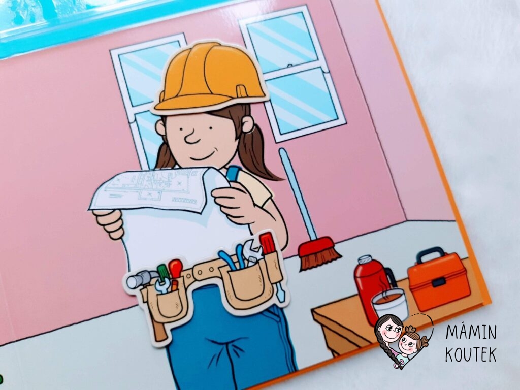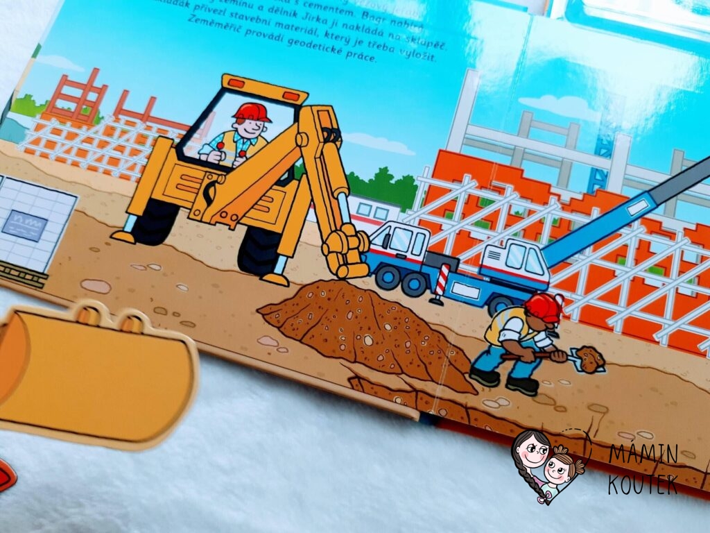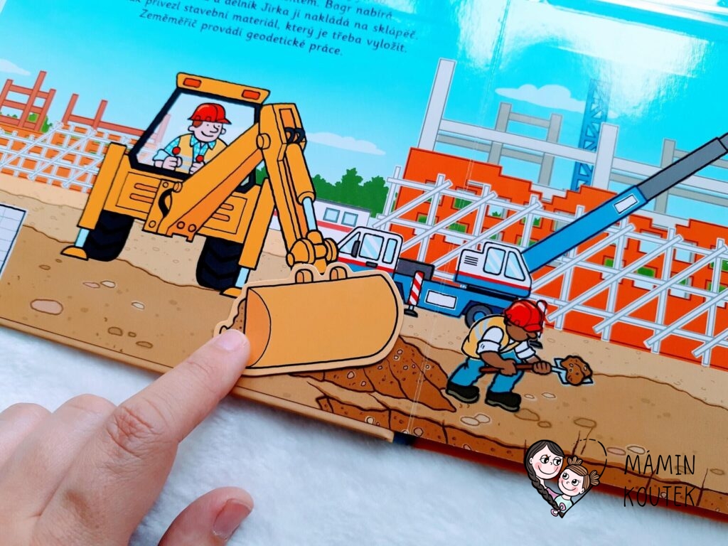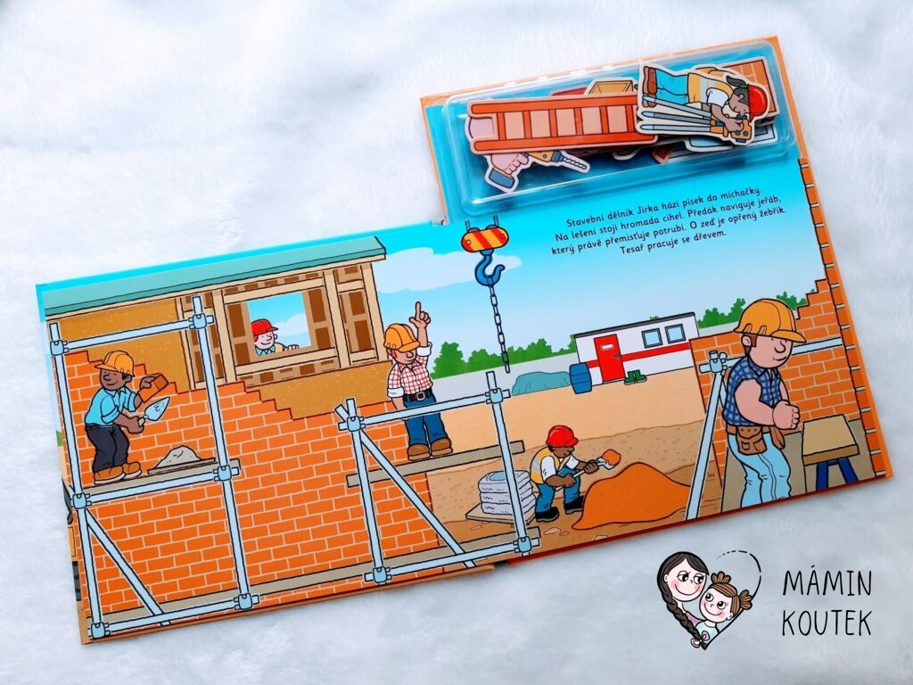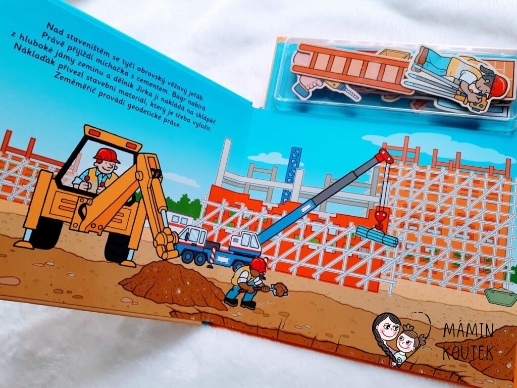 Kniha obsahuje celkem 4 tematické dvojstránky, na kterých najdou děti různé výjevy spojené se stavbou. Jako první vidíme velké staveniště s věžovým jeřábem. Děti mohou magnetkami doplnit třeba zeměměřiče, který provádí geodetické práce, náklaďák, který přivezl stavební materiál, bagr, míchačku nebo cokoli dalšího, co uznají za vhodné.