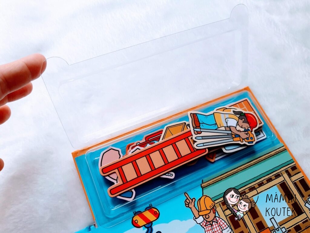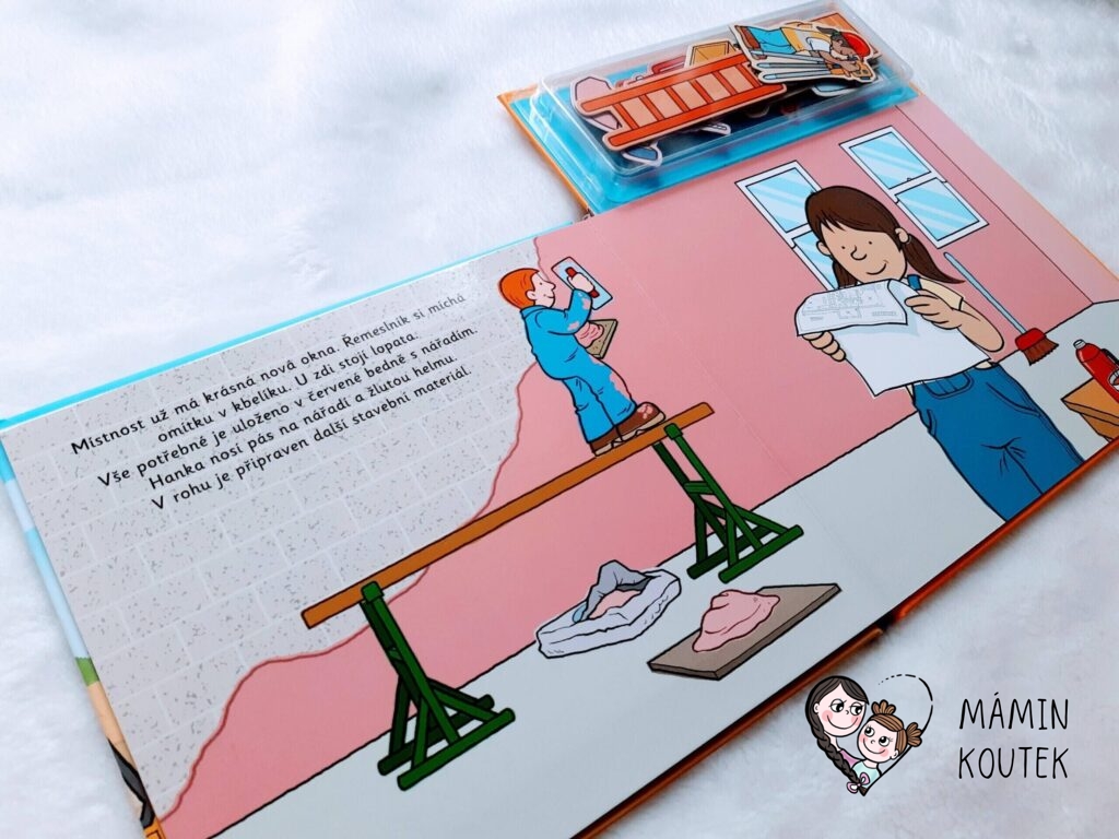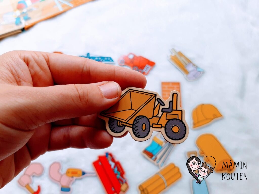 V magnetické knize Stavba si moc nepočtete. Texty na každé stránce sice jsou, ale většinou se jedná o pár vět, které spíše děti navedou, jaké magnetky na stránku umístit. Na druhou stranu i tak nabídne kniha určitě spoustu zábavy.