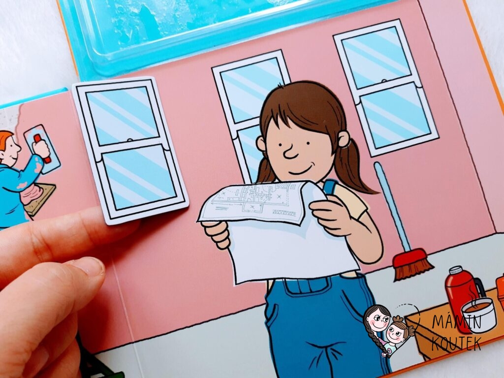 A dostaneme se i dovnitř. Místnost už má krásná nová okna – jedno mohou dokonce doplnit děti formou magnetky. Hanku pak mohou vyzdobit helmou a páskem na nářadí. Do rohu pak umístit třeba stavební materiál nebo lopatu…