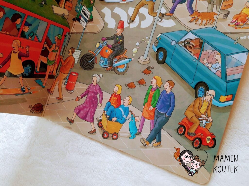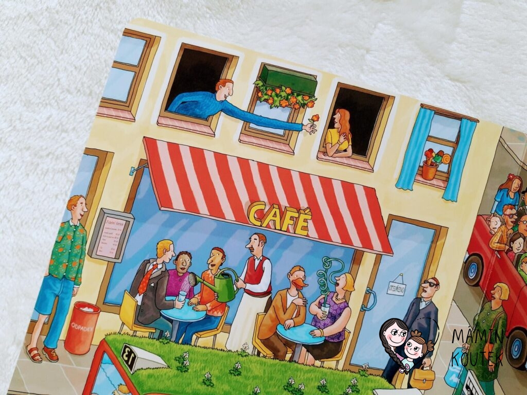 Na další dvojstránce se dostáváme do města. Vidíme kavárnu, dopravní prostředky, lidi a také různé nesmysly – paní venčí na vodítku želvu, kačenky plují po suchém chodníku, pes řídí auto, po městě chodí sněhulák s kabelkou, dítě veze v kočárku otce…