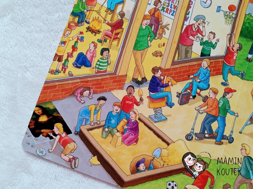 Před školkou je dětské hřiště, kde si hraje spousta dětí. Ale co to? Jedna holčička nakreslila na zem obraz Mona Lisy, chlapec plave v pískovišti, jiný kope do hranatého balonu a někteří dokonce barví keře válečkem s barvou. Na klouzačce se klouže po schodech, plyšový medvídek skáče panáka…