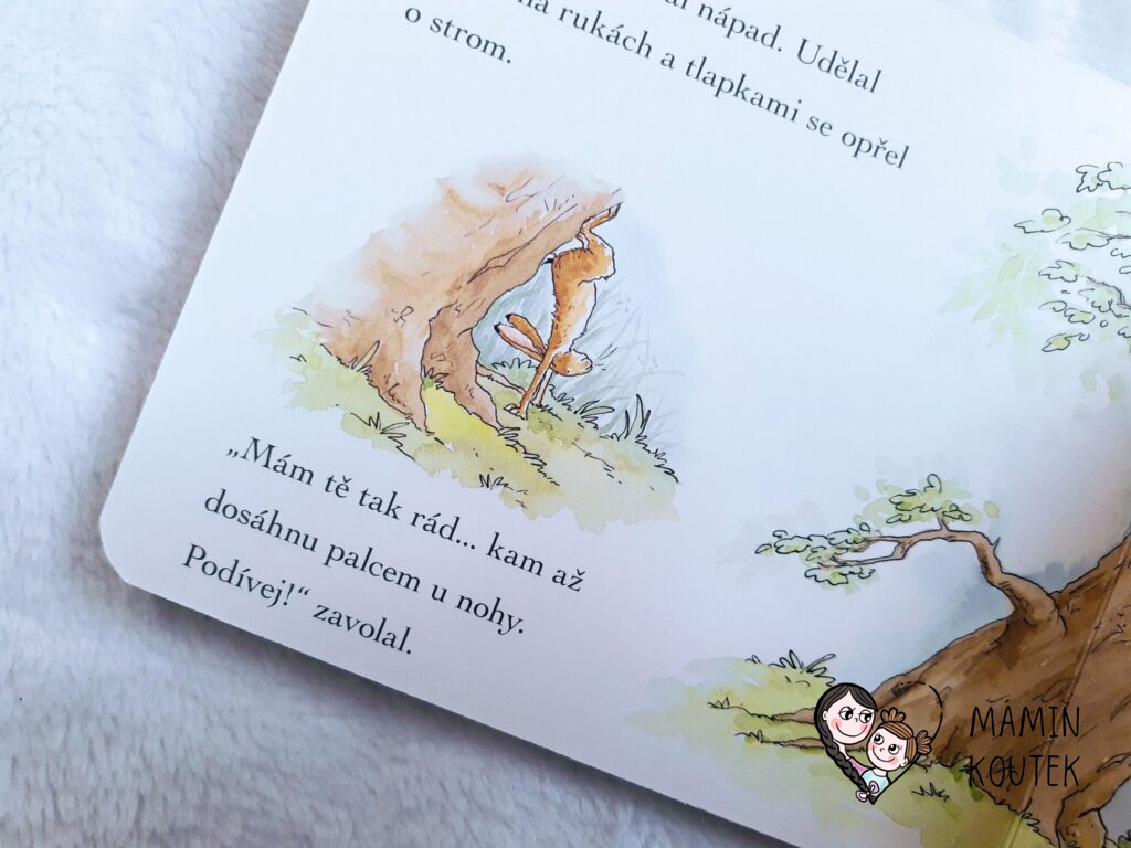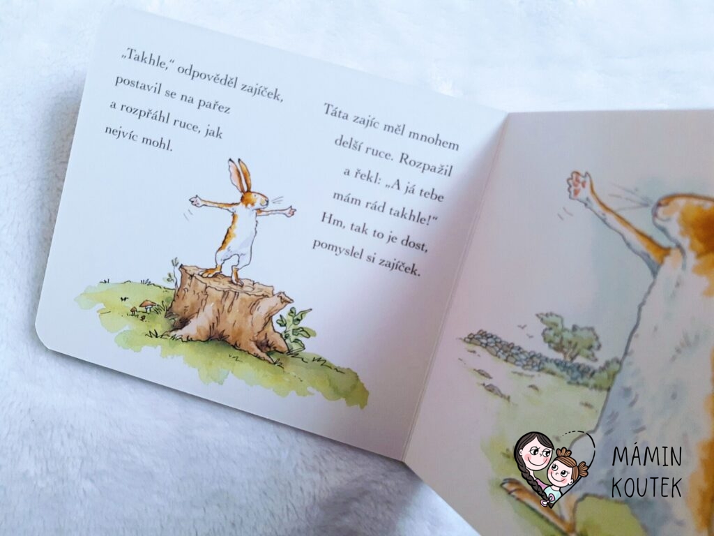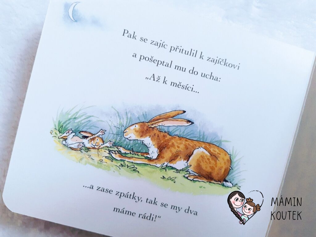 A podobně pokračuje příběh i na dalších stránkách. Když už je zajíček unavený, podívá se do dálí a řekne tátovi, že ho má rád tak, jak daleko je to k měsíci. Jak na to táta zareaguje?