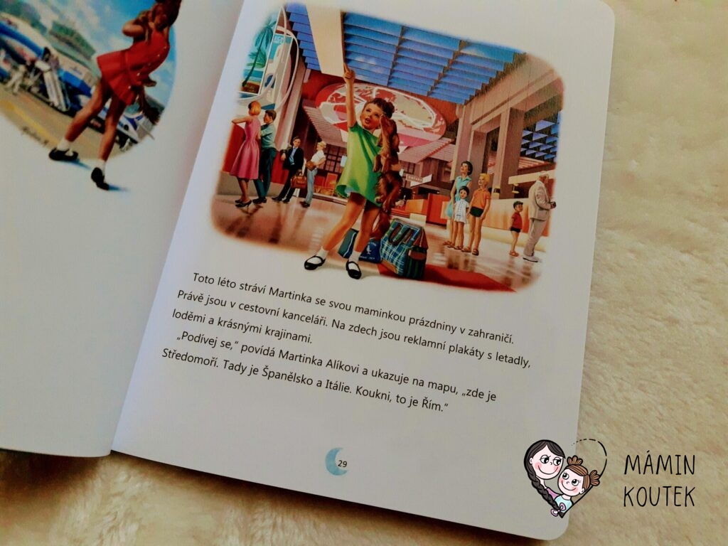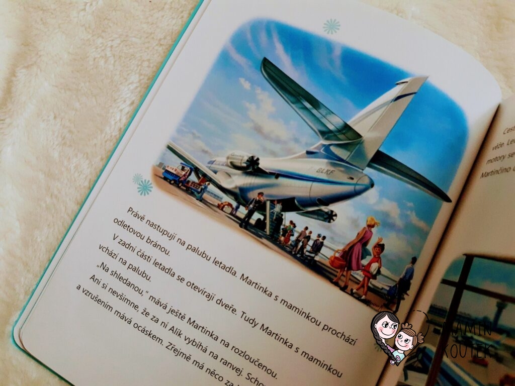 Martinka se se svou maminkou vydává do zahraničí, konkrétně do Itálie. To by nebylo nic zvláštního. Jenže ony poletí letadlem. Martinka navíc poprvé v životě. A čtenáře hned seznámí s tím, jak to na letišti chodí – jak vypadá letadlo, kudyma se do něj chodí, co dělá kontrolní věž, jak vypadá kokpit a kdo tam sedí, jak to vypadá v letadle, o co se stará letuška a mnoho dalšího. Jaké překvapení, když ale z letadla v Říme vyletí i pejsek Alík. Kde se tady vzal?