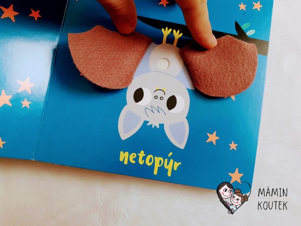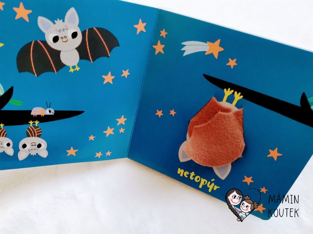 Jako třetí najdeme v knize netopýra. Zde je už zvukové tlačítko skryté, takže dětí musí hledat. Nachází se totiž pod složenými křídly.