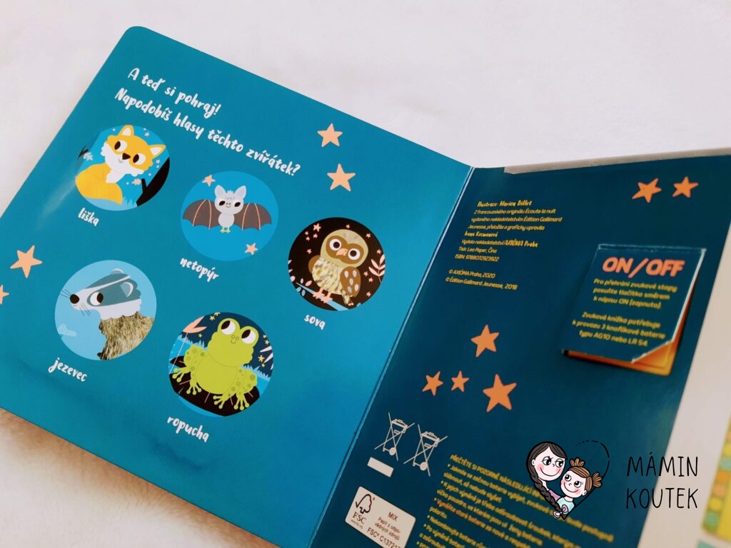 Zvuky jsou jako reálné a tím, že se jedná o noční zvířata, tak i trošku strašidelné. Beky ale baví je pořád dokola pouštět. Natálka naopak objevuje jen jednotlivé srtsti, hladí a tahá. Kniha je tedy vhodná pro nejmenší čtenáře i jejich sourozence.
