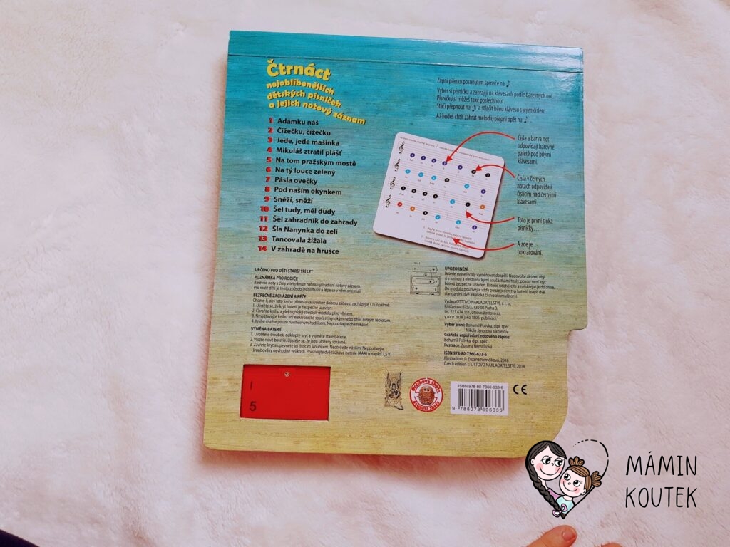Klavírek je menší, akorát na dětskou ručičku. Děti na něj mohou hrát bud samy nebo si zapnou již nahranou písničku z knížky. A tu třeba doproví svým zpěvem. Klavírek je na baterie, které jsou součástí balení.