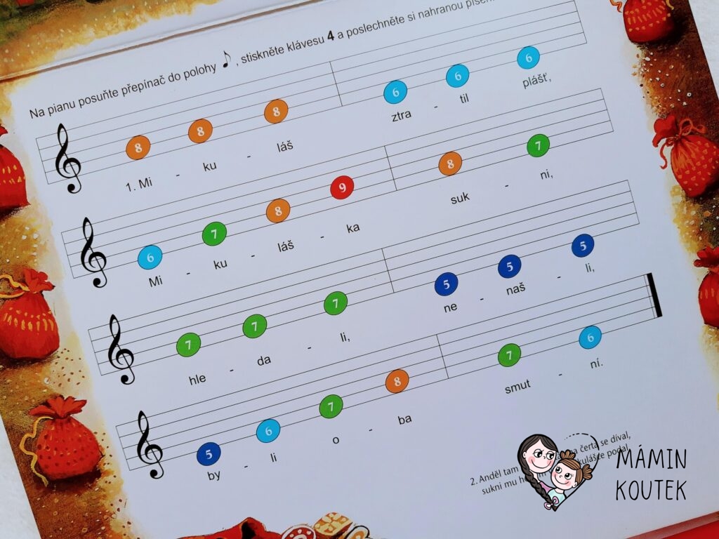 Noty jsou uzpůsobené tak, aby hraní zvládly i malé děti, které ještě na klavír neumí. Noty jsou totiž barevné označené, stejně jako klávesy na klavírku. Pro lepší přehlednost má také každý ton své číslo, takže starší děti se mohou orientovat i podle toho. Mimo not samozřejmě písničky obsahují také texty, a to i několik slok.
