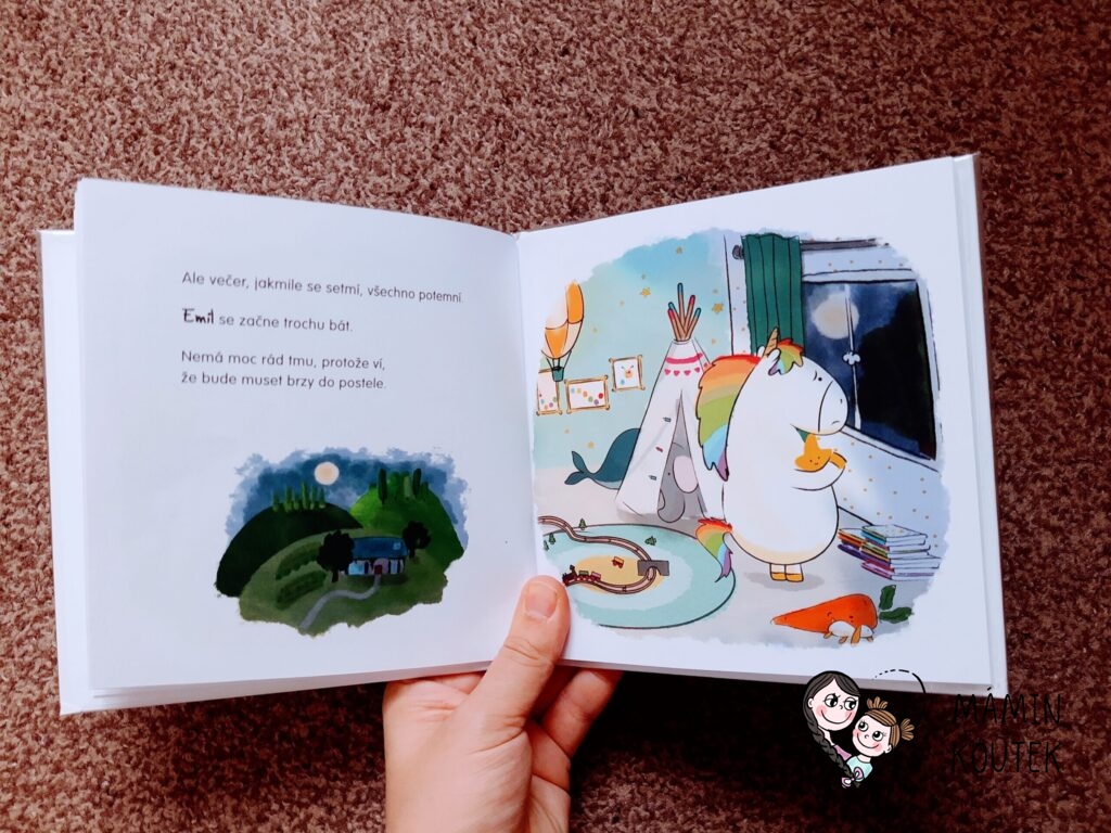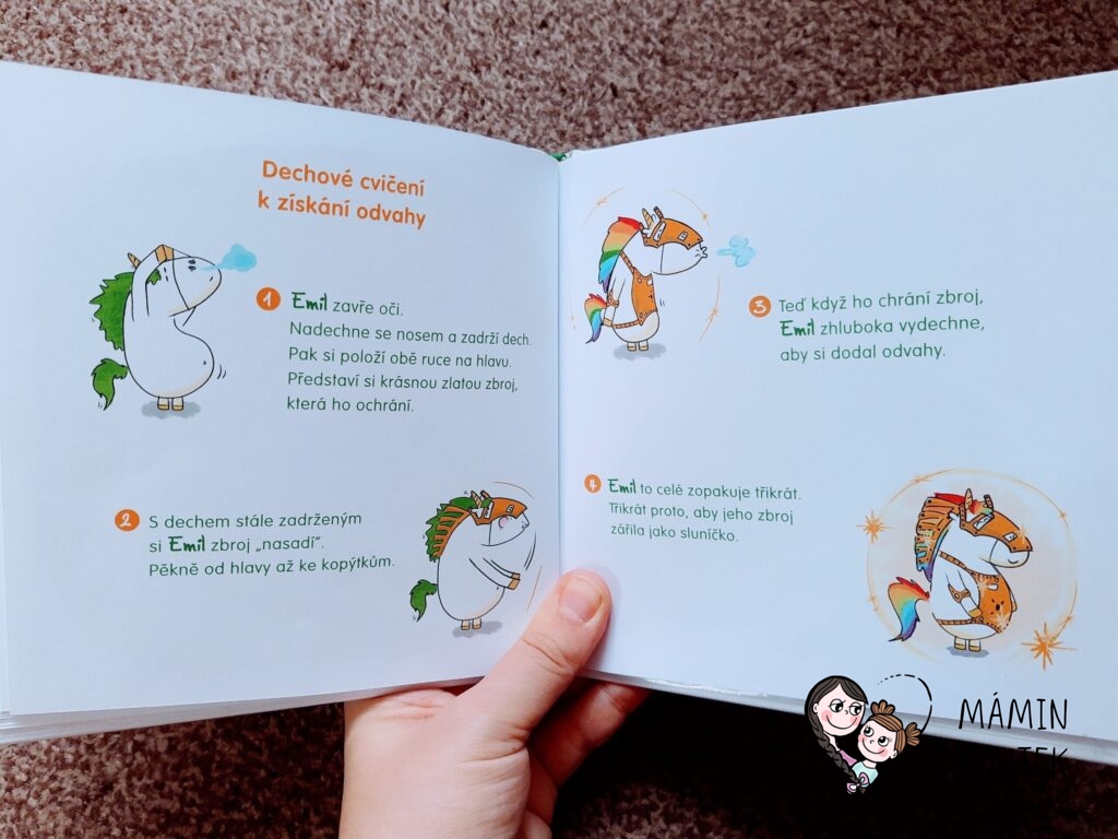 V knize najdeme krátký příběh o jednorožci Emilovi, který nemá rád noc. Při ní je totiž tma a ten on se moc bojí. Pak ale vyzkouší jednoduché dechové cvičení a rázem je klidnější!