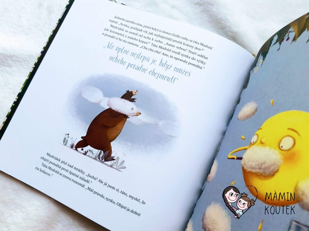 Táta Medvěd svému synoví prozradí, že nejlepší prožití dne je, když může někoho pořádně obejmout. Malý Medvídek odvětí, že objetí pomáhá proti špatné náladě. Dle tatínka je ale dobré na ledacos. A to se hned rozhodnou vyzkoušet v praxi.