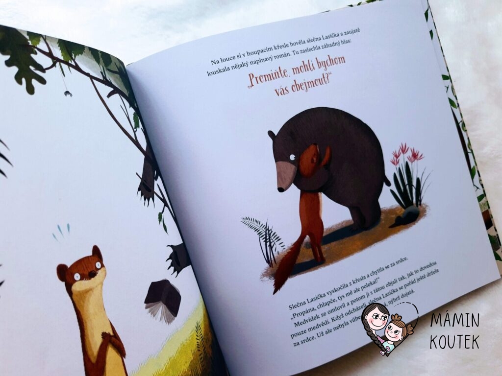 Textu v knize není moc, takže ji máte přečtenou za chvíli a je vhodná i pro začínající čtenáře. Otázky, kdy se medvědi ptají ostatních, jestli je mohou obejmout, jsou barevně odlišené a jsou také psané jiným písmem, čímž je celý text trochu ozvláštněn.