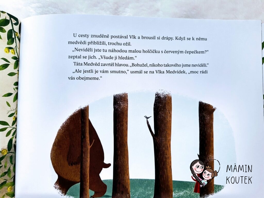 Poté obejmou zajíce a dostanou se i k vlkovi, který vyhlíží červenou Karkulku. Medvídek se ho zeptá, jestli ho mohou obejmout. Vlk souhlasí a je z toho nakonec tak okouzlený, že si ani nevšimne, že kolem Karkulka zrovna prošla. A to si prozpěvovala.