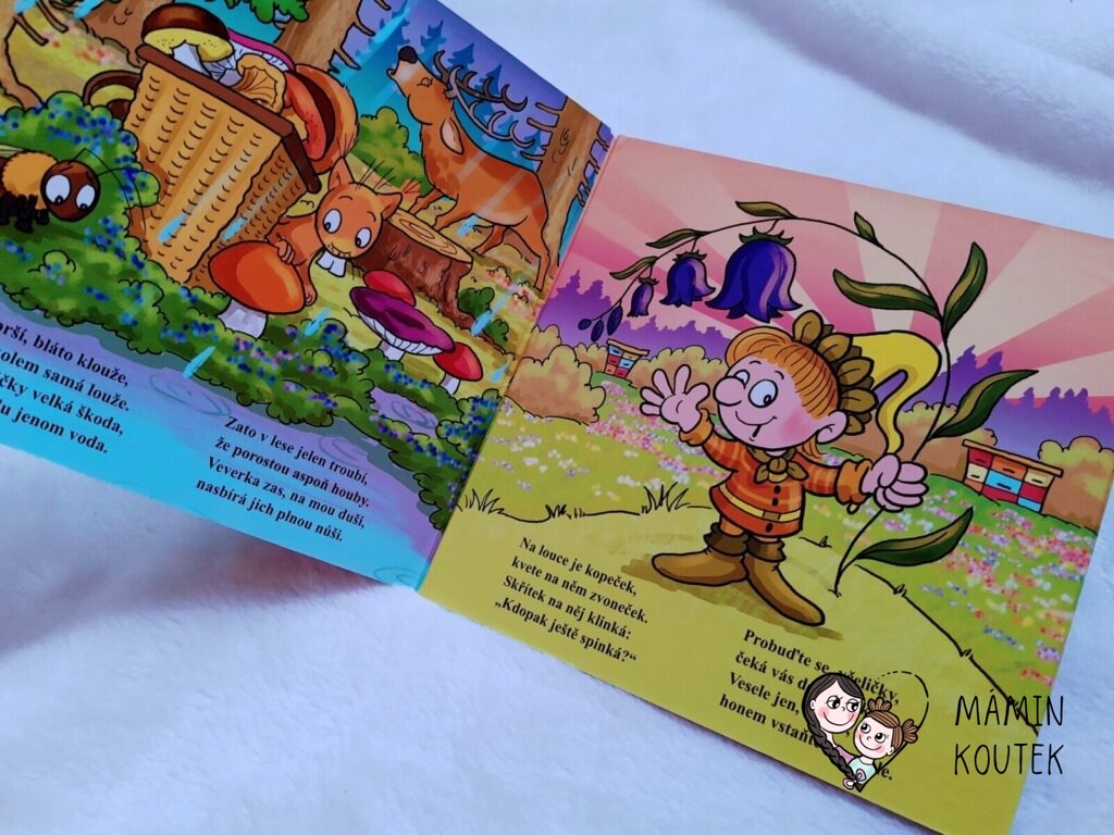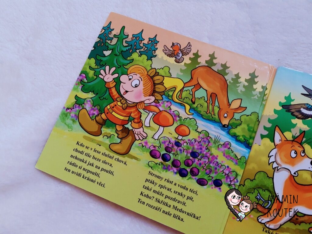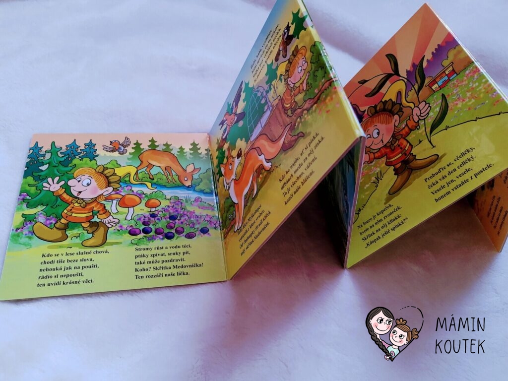 Leporelo z Medovníčkova lesa přináší krátké básničky z lesního prostředí. Nejsou jen obecně o přírodě či zvířátkách, ale děti zde mohou sledovat také krátký příběh o skřítkovi, což mi přijde zábavnější.
