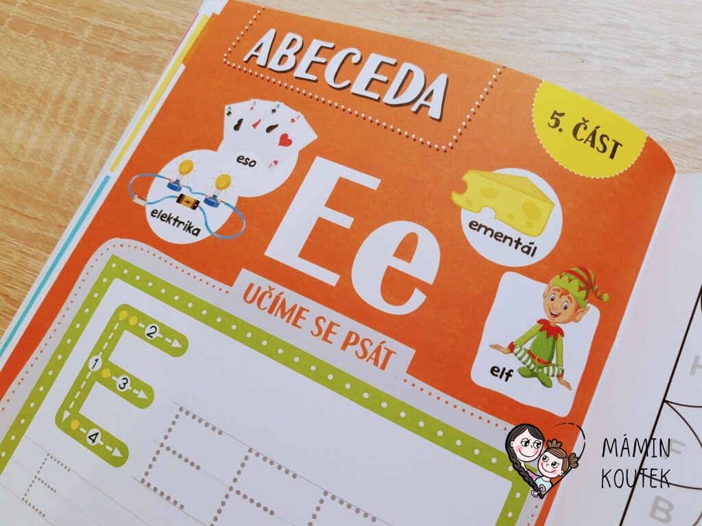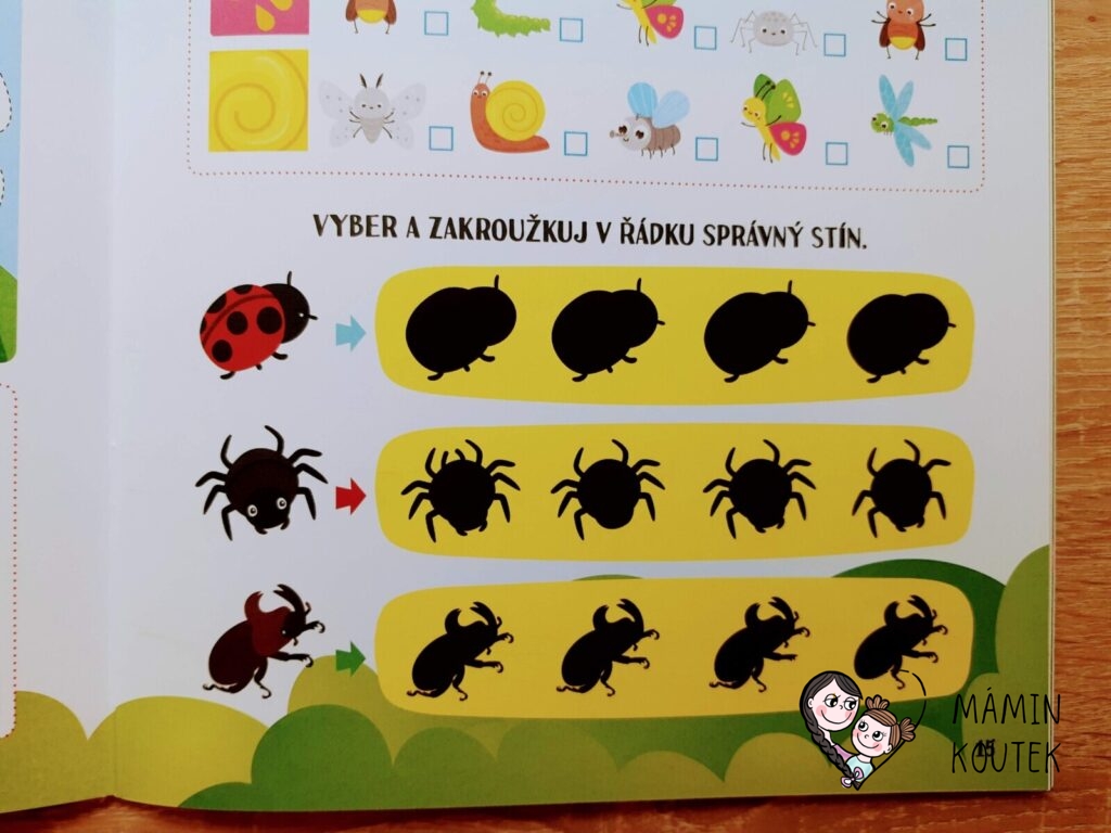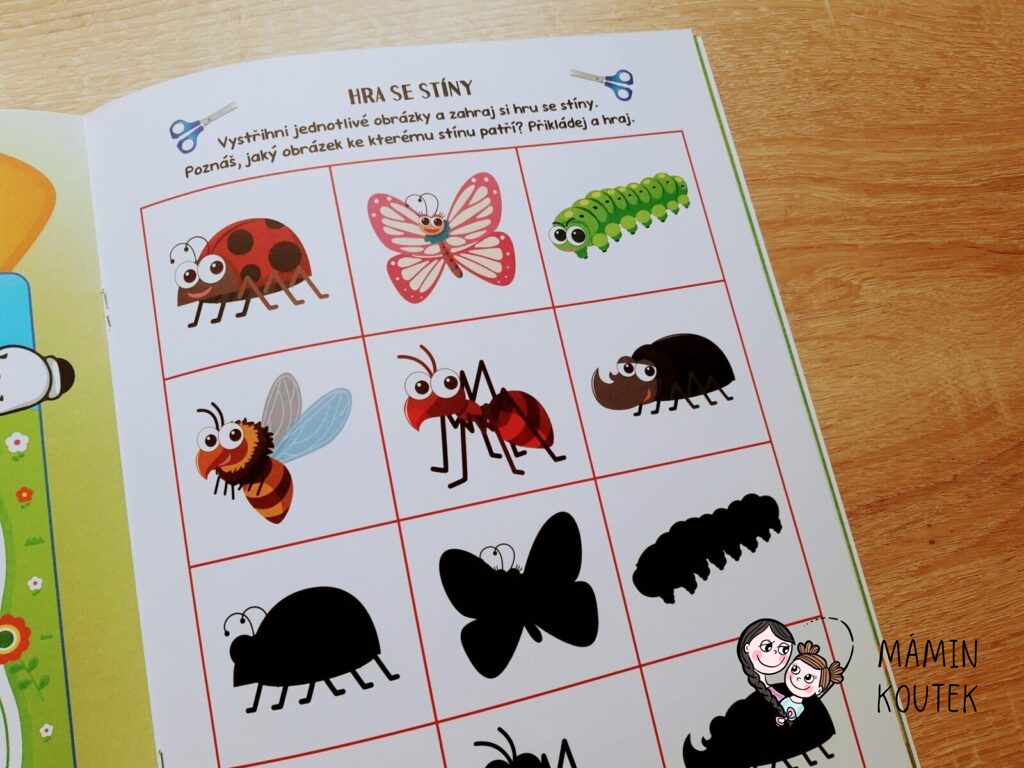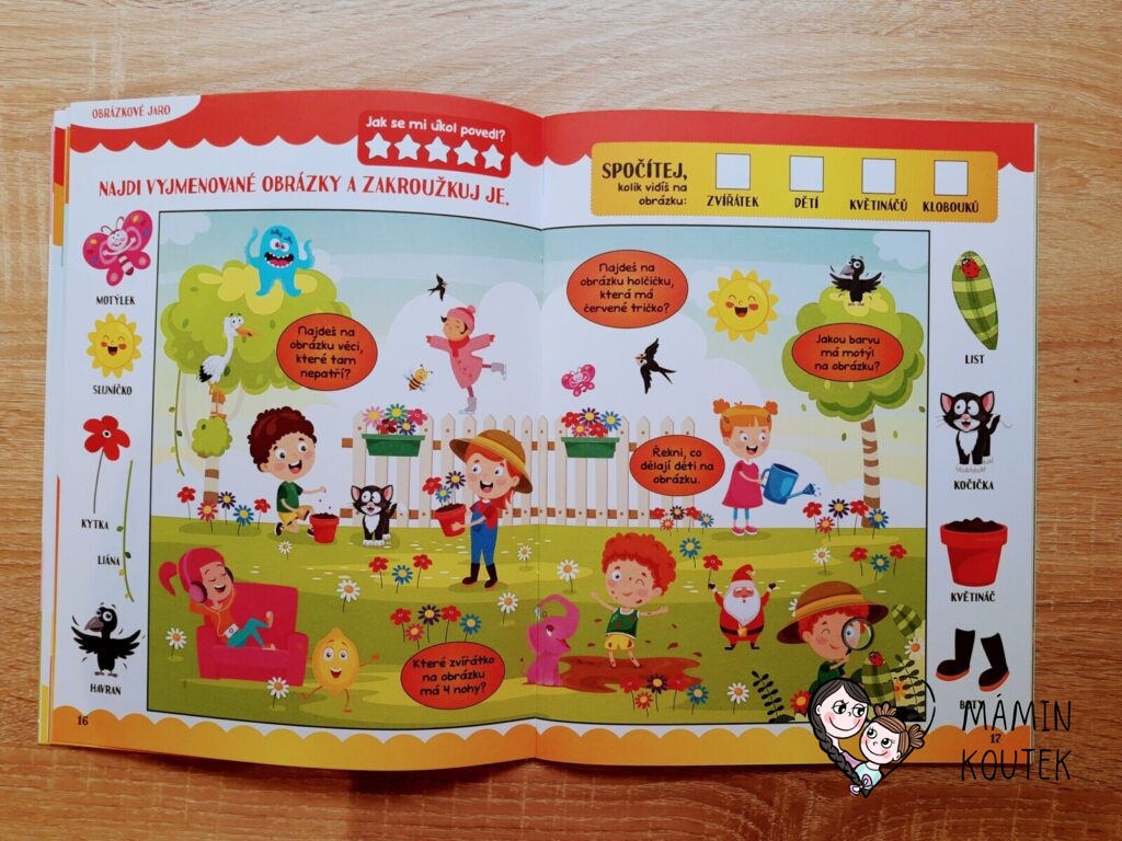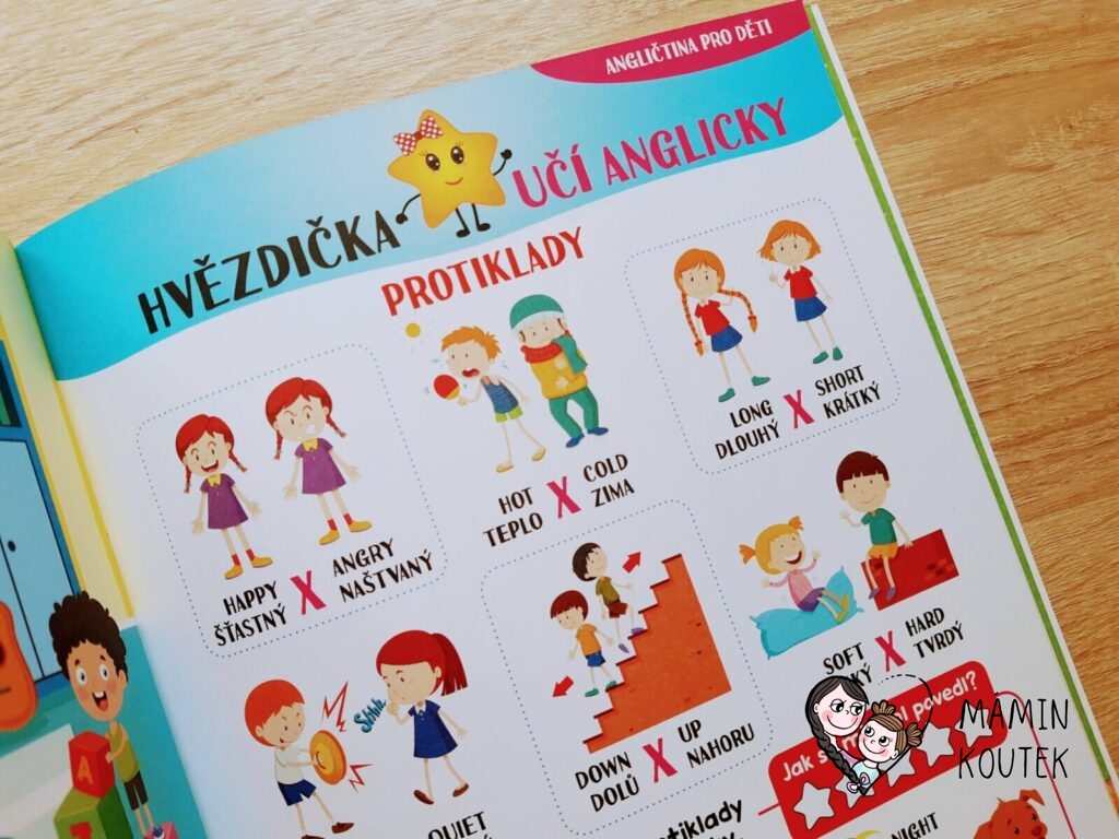 Jedna stránka se zabývá také angličtinou. Je na určité téma (např. protiklady), obsahuje obrázky a pod nimi anglický název, který mohou dětem rodiče přečíst.
