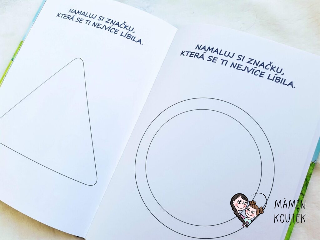 Na závěr je v knize obrys trojúhelníku a kruhu. A děti si do nich mohou nakreslit značku, která se jim nejvíce líbila.