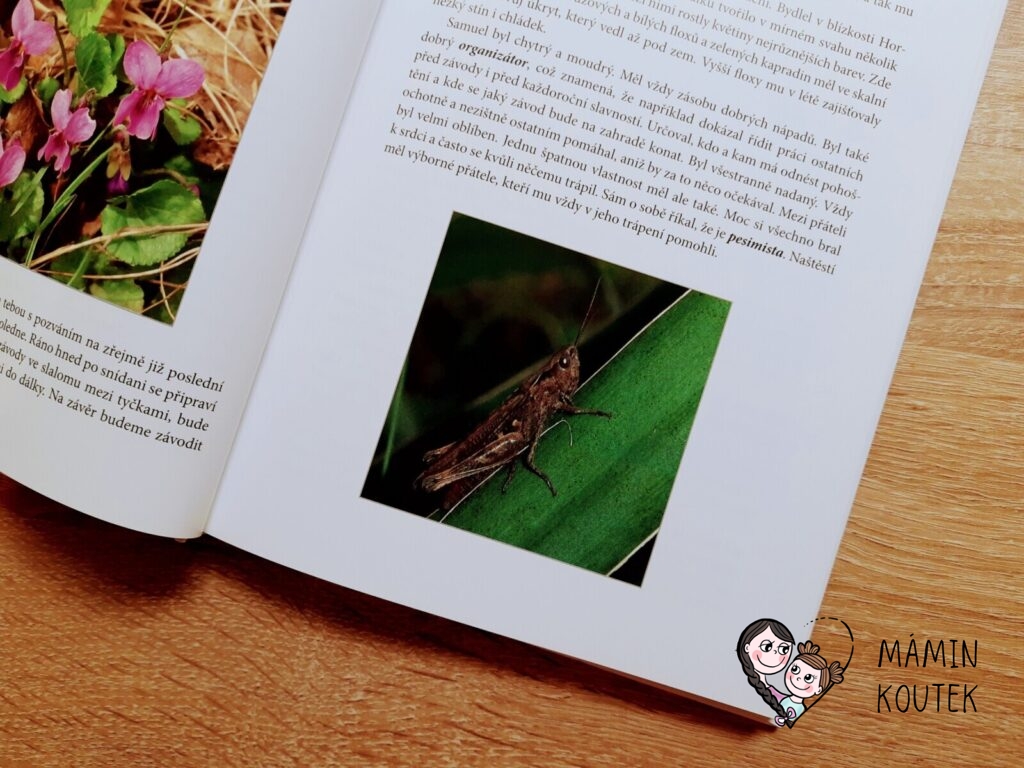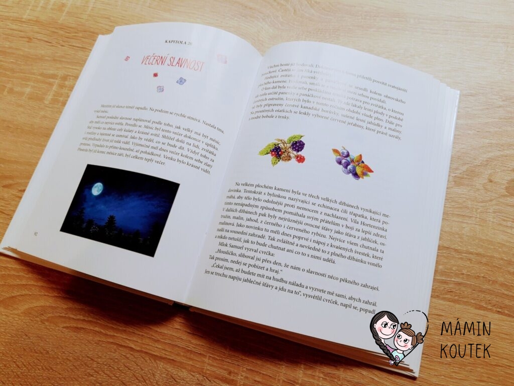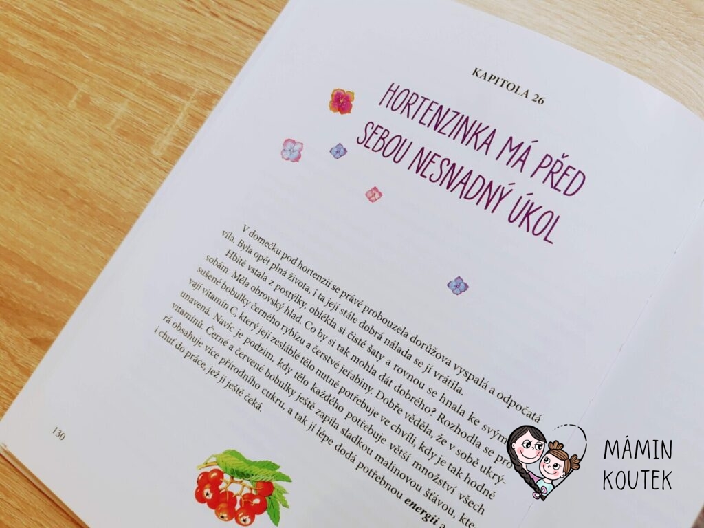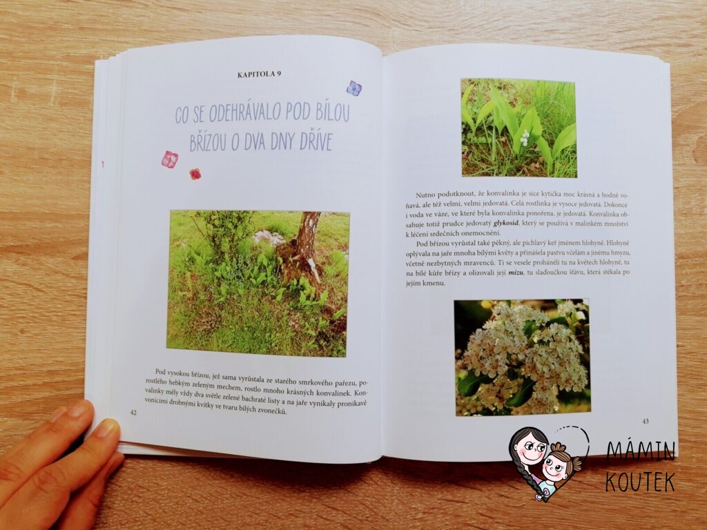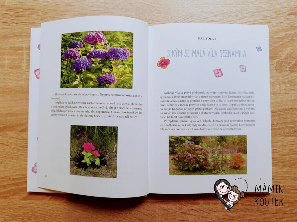 Co mě trochu zarazilo je grafické zpracování knížky. Kniha obsahuje spoustu reálných fotek. Osobně mi to ale do pohádkové knížky pro děti tolik nesedí. Někdy jsou na obrázích konkrétní rostliny či zvířátka, jindy je ale na obrázku jen část zahrady, chaty nebo nebe (a to jako bych si to fotila já někde při procházce), takže obecné obrázky, které dle mého děti nemají čím zaujmout. K tomu jsou součástí příběhu občas i kreslené obrázky, což na mě působilo trochu roztříštěně. Na druhou stranu je fajn, že děti vidí, jak dané rostliny či zvířáta vypadají ve skutečnosti. Jen škoda, že to není nějak lépe odděleno.