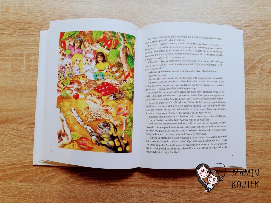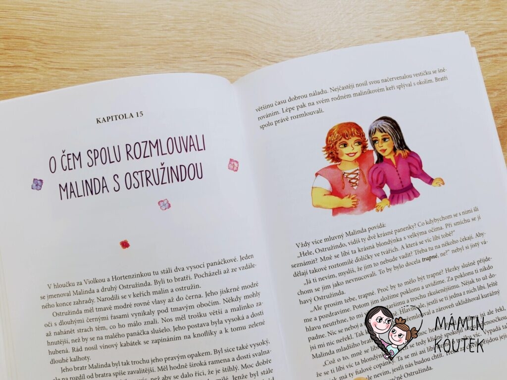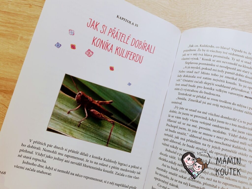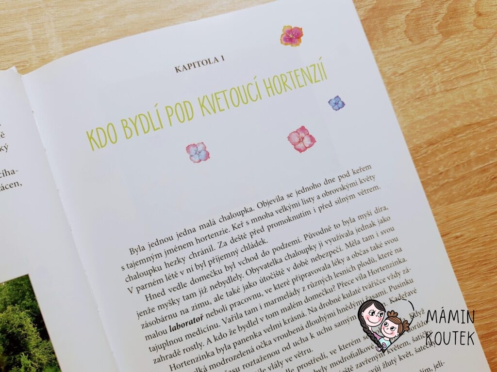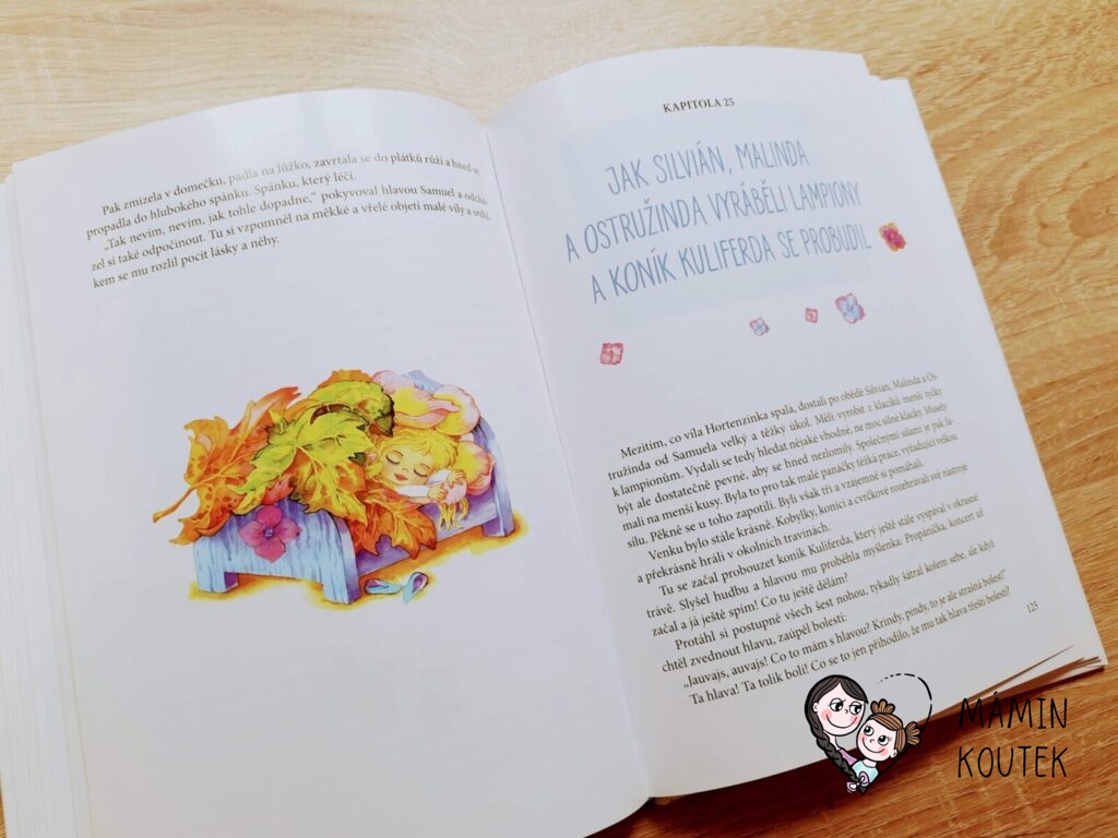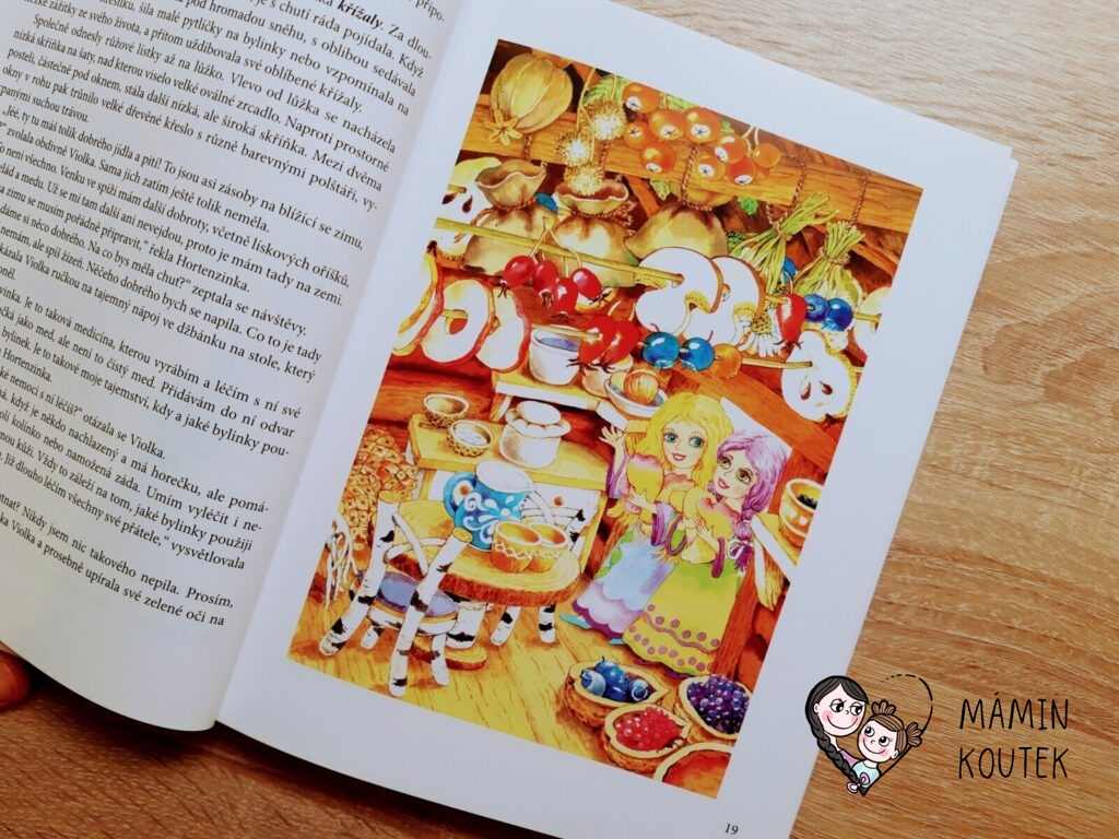Co mě trochu zarazilo je grafické zpracování knížky. Kniha obsahuje spoustu reálných fotek. Osobně mi to ale do pohádkové knížky pro děti tolik nesedí. Někdy jsou na obrázích konkrétní rostliny či zvířátka, jindy je ale na obrázku jen část zahrady, chaty nebo nebe (a to jako bych si to fotila já někde při procházce), takže obecné obrázky, které dle mého děti nemají čím zaujmout. K tomu jsou součástí příběhu občas i kreslené obrázky, což na mě působilo trochu roztříštěně. Na druhou stranu je fajn, že děti vidí, jak dané rostliny či zvířáta vypadají ve skutečnosti. Jen škoda, že to není nějak lépe odděleno.