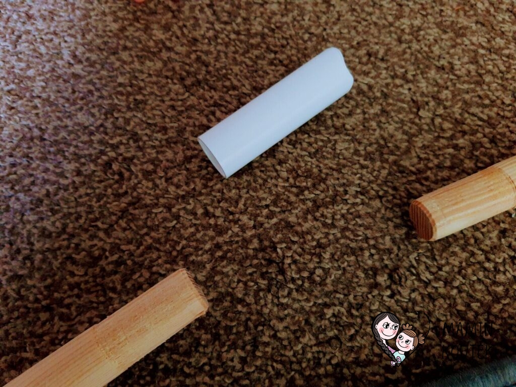 Teepee tvoří 4 tyče z borovicového dřeva, které jsou uprostřed spojené (celkem bylo tedy v balení 8 menších tyčí, aby se to lépe převáželo). Tyčky šly jednoduše spojit pomocí zasunutí, poté se navlékly do pláště stanu a nahoře uvázaly (bavlněná stuha byla součástí balení).