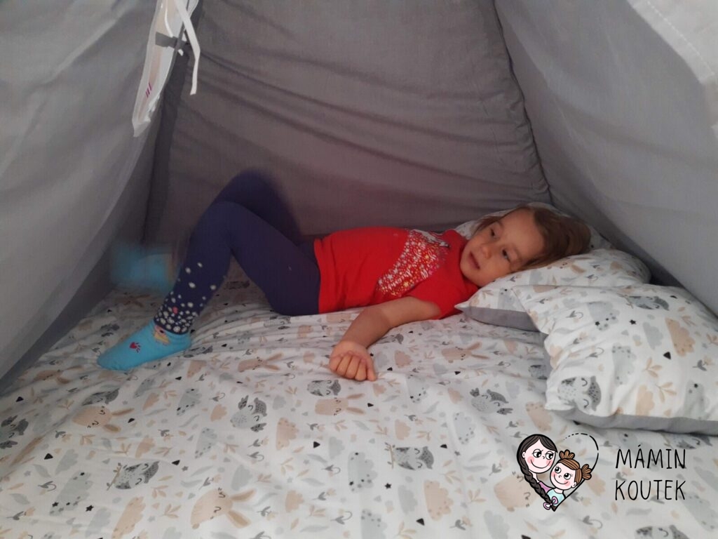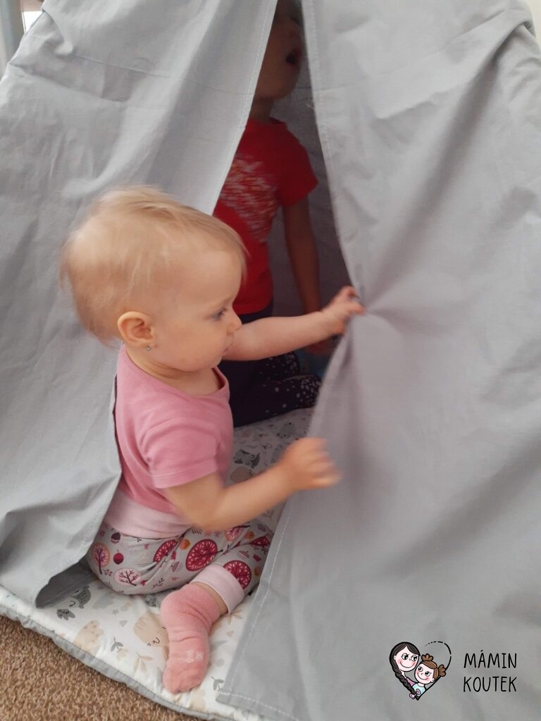 Nejčastěji si tam obě holky jen tak zalezou s nějakou hračkou. Nebo i bez ní, když jsou spolu. A lezou pořád tam i zpět. Čtyřletá Beky si ve stanu často roztáhne Barbie, panenky a jejich oblečky, což jen vítám, protože to alespoň není pohozené po celém pokoji. Roční Naty má zase ráda hru na schovávanou (při ní tam dokonce donutila vlézt i mě).