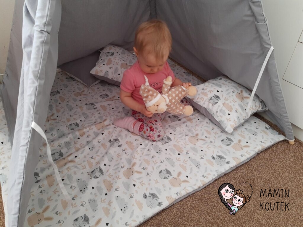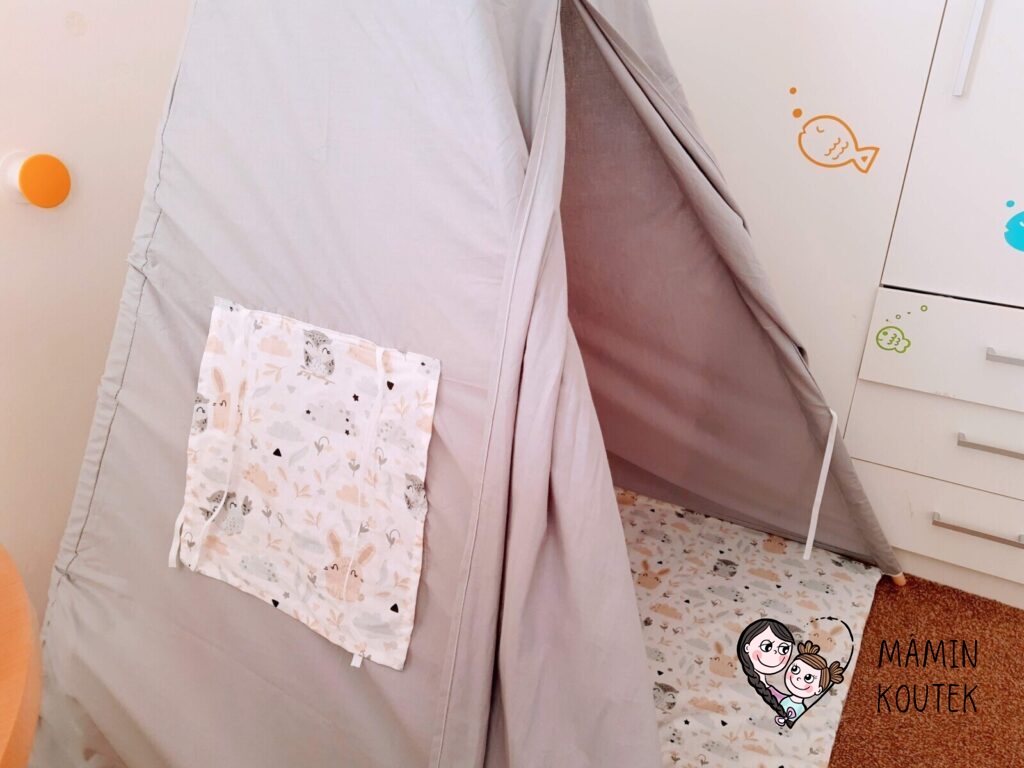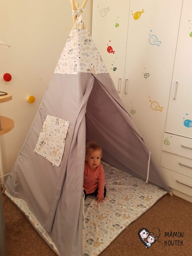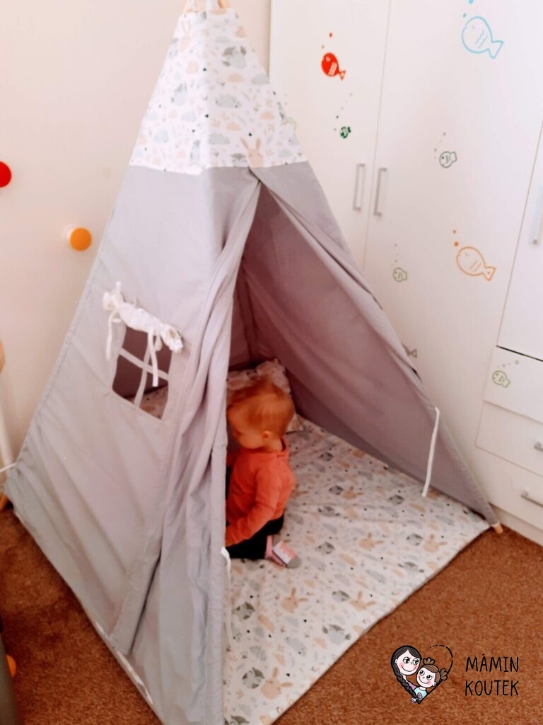TeePee máme z e-shopu Expedo, kde se dá pořídit za akční cenu 1790 Kč. Na výběr je více barevných variant. My jsme zvolili šedou se zajíčky, protože se mi líbilo, že je podložka v této verzi strakatá a nepůjdou tam díky tomu tolik vidět případné fleky.