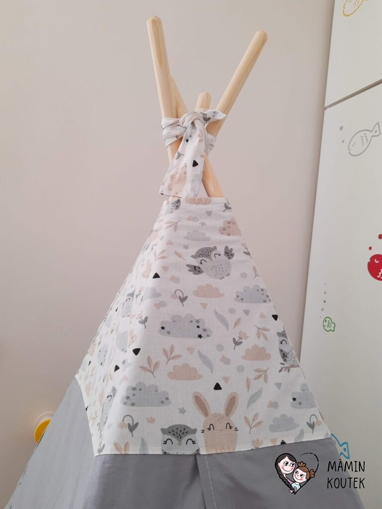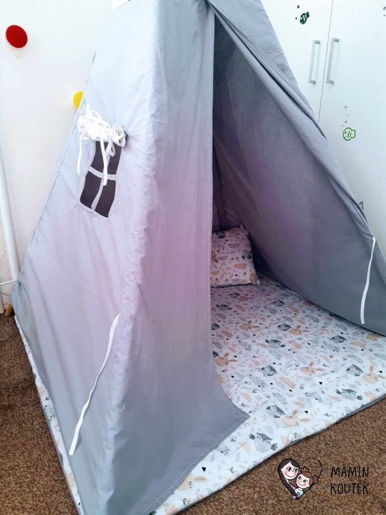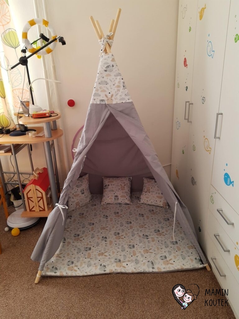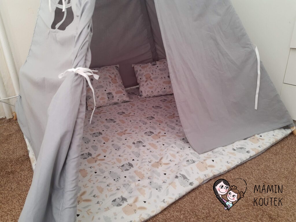 TeePee máme z e-shopu Expedo, kde se dá pořídit za akční cenu 1790 Kč. Na výběr je více barevných variant. My jsme zvolili šedou se zajíčky, protože se mi líbilo, že je podložka v této verzi strakatá a nepůjdou tam díky tomu tolik vidět případné fleky.