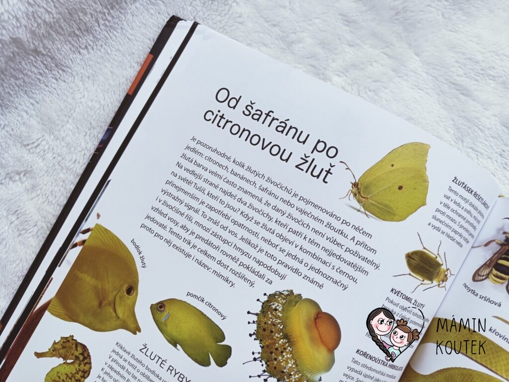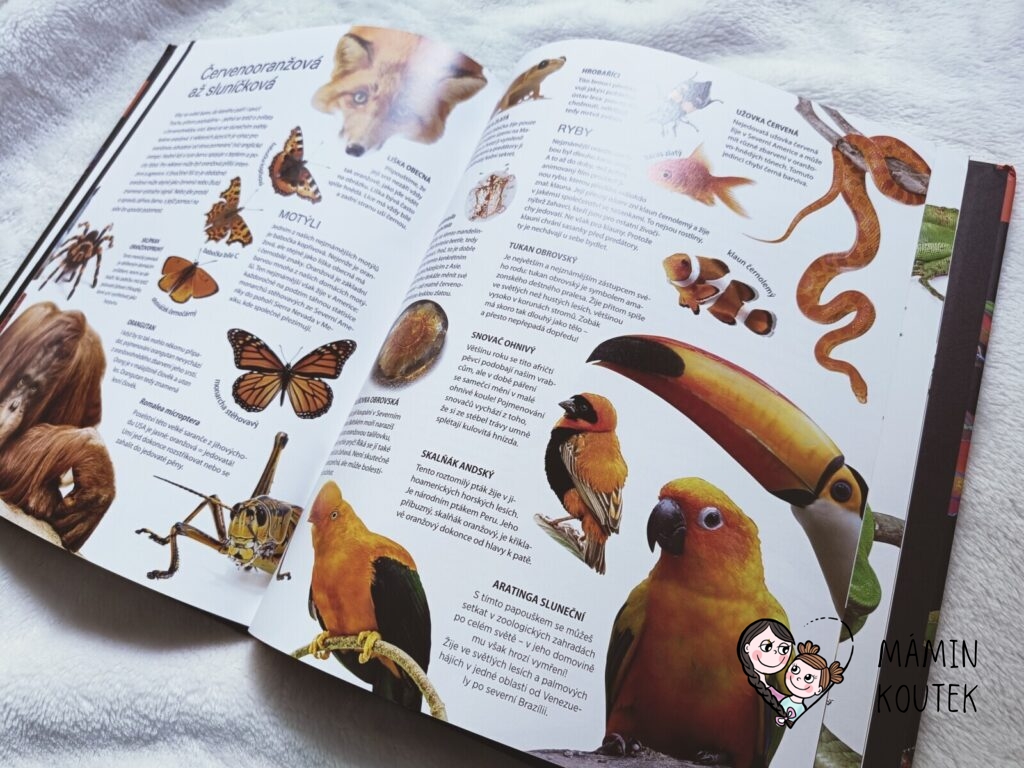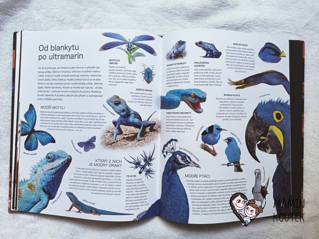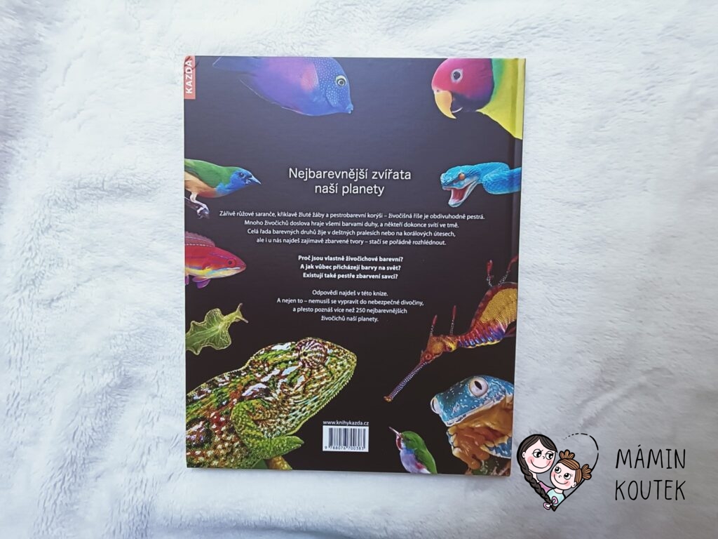 Jakmile jsme ale knihu s Beky (4 roky) otevřeli, zjistila jsem, že se opět jedná o trochu netradiční knížku o zvířatech. Taková malá encyklopedie, kde hraji hlavní roli zvířata a jejich barva, což je neobvyklé, ale zajímavé. Obzvláště díky povedených obrázkům, na kterých zvířata vypadají jako živá.