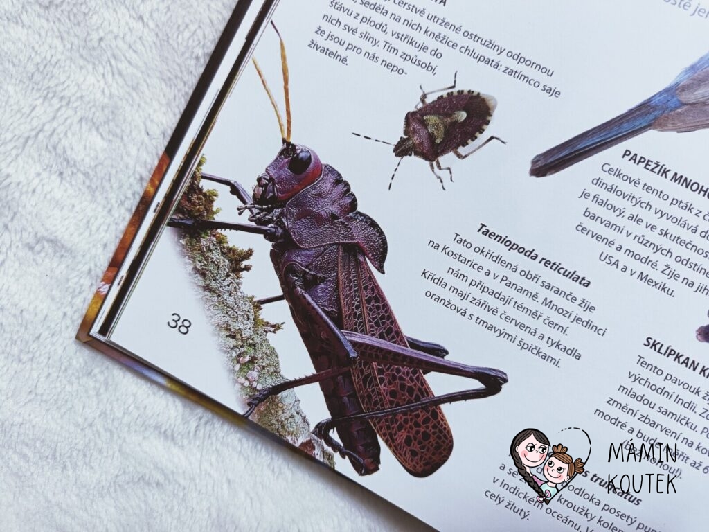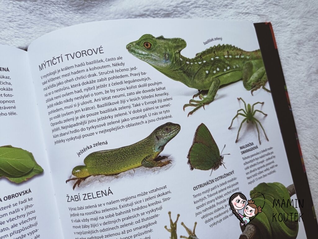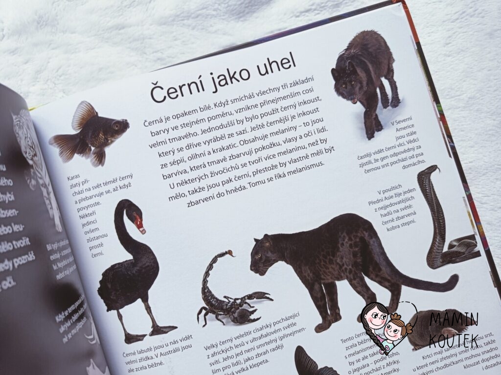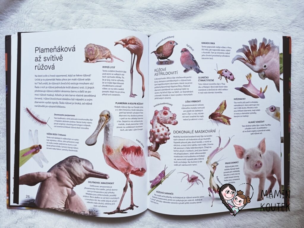 Jakmile jsme ale knihu s Beky (4 roky) otevřeli, zjistila jsem, že se opět jedná o trochu netradiční knížku o zvířatech. Taková malá encyklopedie, kde hraji hlavní roli zvířata a jejich barva, což je neobvyklé, ale zajímavé. Obzvláště díky povedených obrázkům, na kterých zvířata vypadají jako živá.
