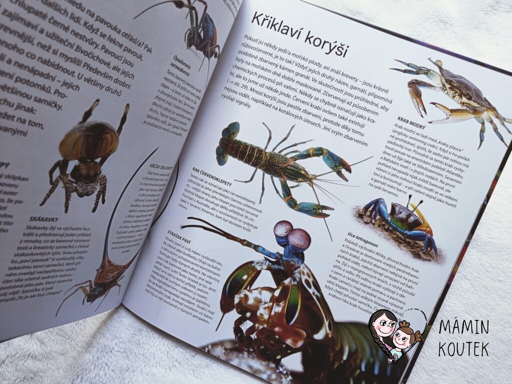 Dále se čtenáři seznámi s osminočci (pavouky), korýši (rakem, straškem pavím či krabem), rybami a také s různými druhy ptáků – pěvci, papoušci, šplhavci, hrabaví ptáci či holubi.