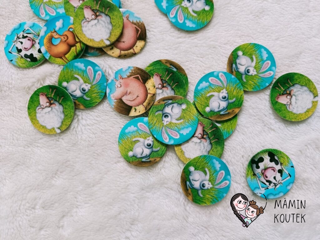 Součástí hry je celkem 120 žetonů (kartiček) se zvířaty – 60 z nich je s obrázkem králiků, 24 s ovcí, dále najdeme v balení 20 prasat, 12 kráv a 4 koně. Počty jsou dané podle toho, jak si stojí zvířata na kostce a v pyramidě (viz základní hrací plocha). Koně je nejobtížnější dostat, proto jsou pouze 4.