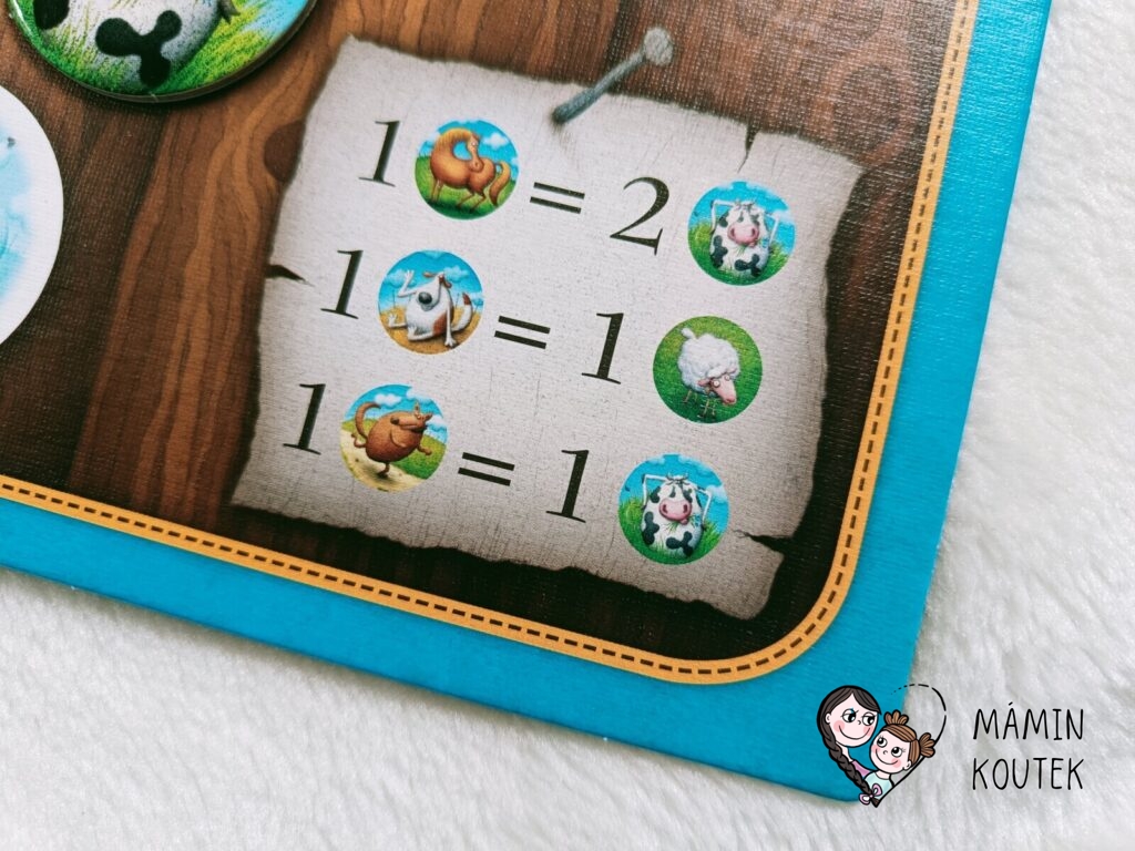 V dolní části pak najde každý hráč přehled, jak může zvířata měnit (např. za kolik kráv může získat prasátko a podobně).