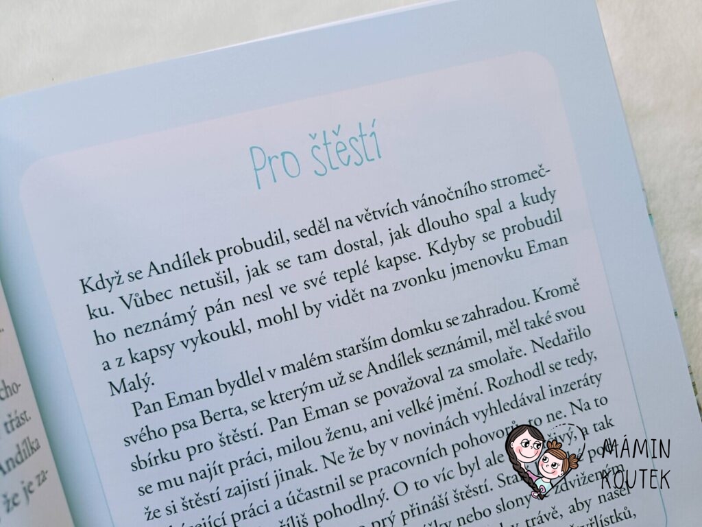 Podaří se mu chytit se Anežčiny kočky a ta ho vynese ven, aniž by tušila. Jenže venku je zima. Andílek je promočený, nešťastný a na pokraji sil. A takhle ho najde pan Eman, který je hodně pověrčivý. Sbírá vše, co by mělo přinést šestí (místo toho aby šel štěstí naproti a něco pořádného udělal). Doma má už spoustu sušených čtyřlístků, kominíčky, slony s chobotem nahoru a mnoho dalších talismanů. Andělíčka umístí na Vánoční stromeček.