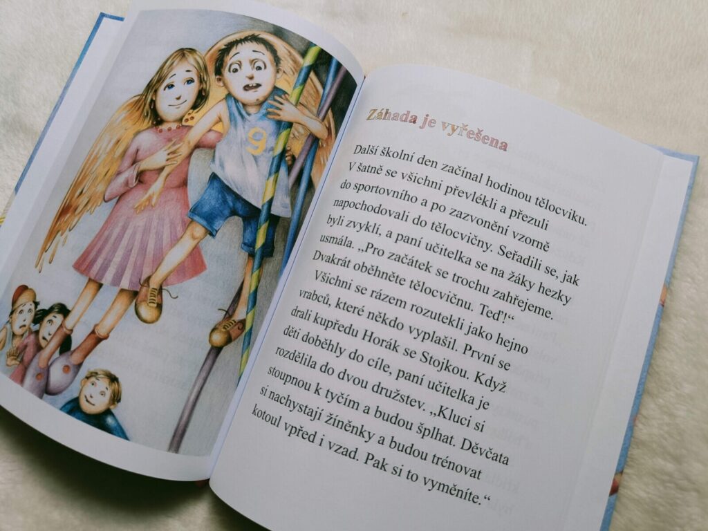 Druhý den v tělocviku děvčata trénovala kotouly a kluci šplhali po tyči nahoru. Paní učitelka Jasmína byla zrovna u dívek, když uslyšela křik – Tadeáš se nahoře pustil tyče a padal dolů. Paní učitelka najednou roztáhla křídla, která schovávala pod šaty, a Tadeáše zachránila. Ano, byla to kouzelná víla. Děti poprosila, aby o jejím tajemství nikomu neříkaly.
