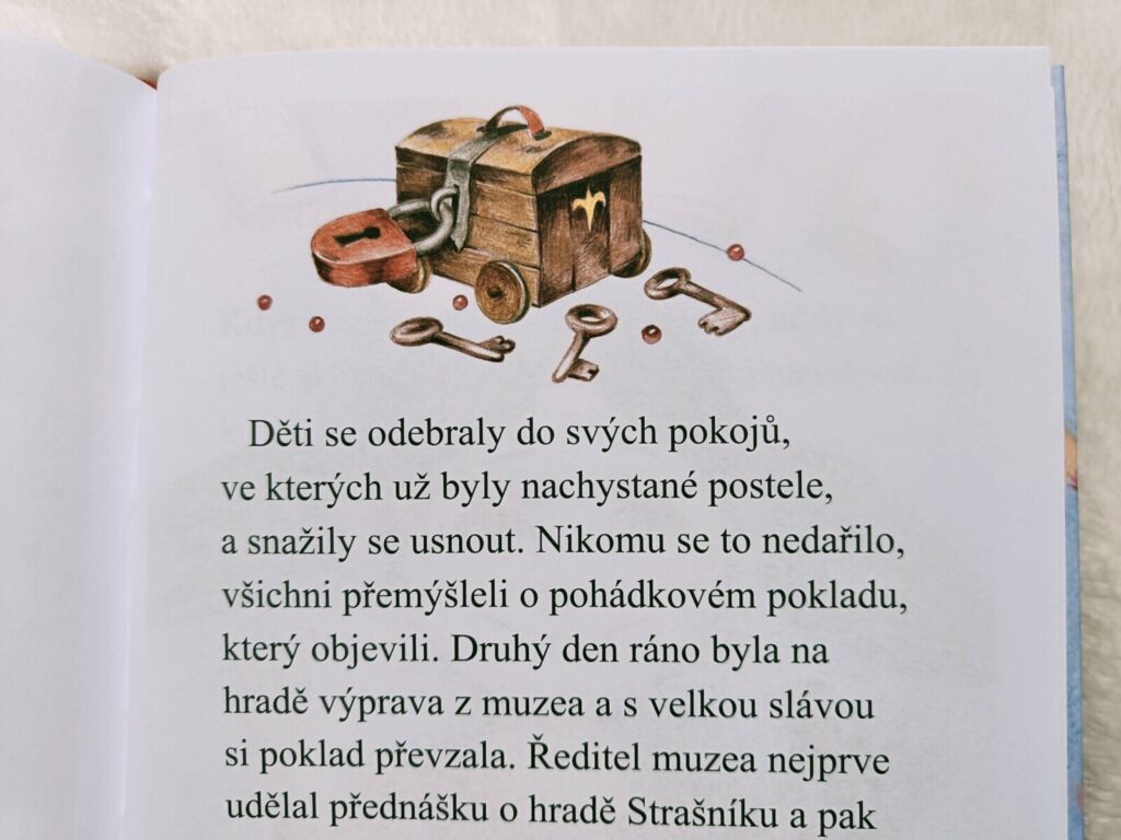 Další den dorazil na kontrolu do třídy sám pan ředitel a nestačil se divit, jak dětem učení šlo. Kdo si sedl na židli u paní učitelky, vypočítal dobře všechny příklady. I čtení šlo dětem skvěle, a tak jim slíbil, že pojedou za odměnu na dvoudenní výlet. Společně s paní učitelkou Jasmínou se děti domluvily, že navštívi hrad Strašník. Tam si užijí určitě zábavy dosyta. A třeba najdou i poklad…
