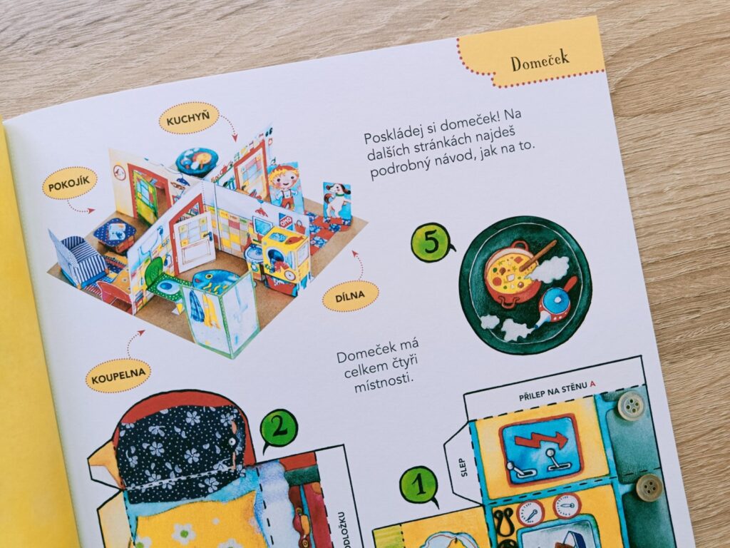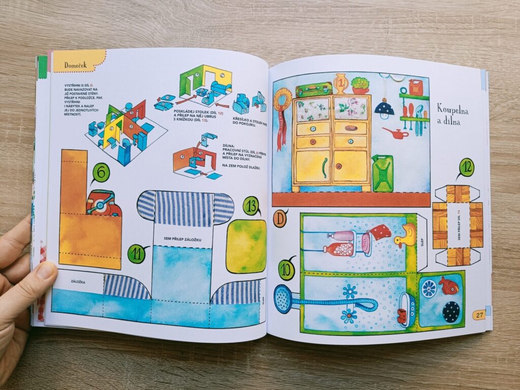 Domeček obsahuje kuchyň, pokojík, koupelnu a dílnu. Tato vystřihovánka je už trošku náročnější a obsáhlejší, ale výsledek stojí za to (my ji skládali už dříve, ale pak ji holky při hraní postupně doničily, takže nyní ji budeme skládat znova).
