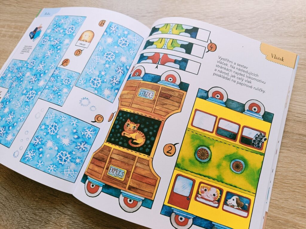 Na své si ve vystřihovánkách přijdou i kluci. Mohou si sestavit autíčko, sněžnou rolbu nebo lokomotivu v osobním vagonem a vagonem na uhlí.